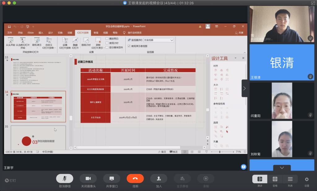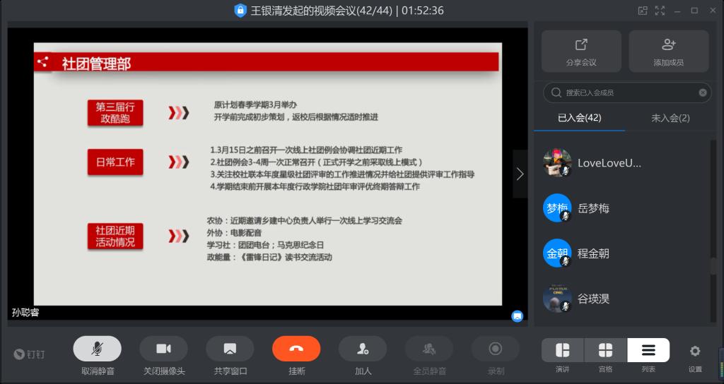 3月8日14时,公司团委通过网络会议的方式召开2020年春季学期第一次工作例会。院团委、员工会及社团负责人全员参会。团委兼职副书记王世亨(2017级本科生)主持本次会议。
