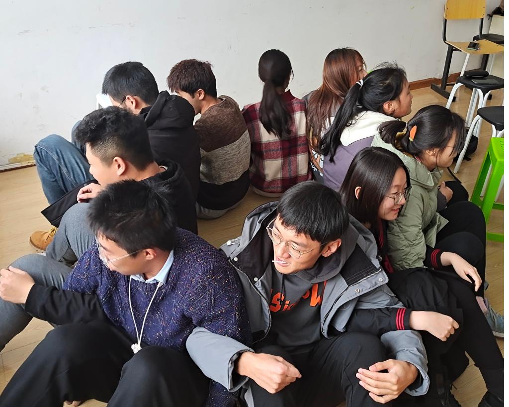 本次活动主要以团体性游戏的方式开展,兼顾趣味性与任务性,使同学们在轻松快乐的氛围里有所体验和收获。活动分为三个阶段。活动开始,最先进行的是“兔子舞”和“温暖传递”,作为热身活动,吸引同学们的兴趣,同时也增进了小组成员之间的互相了解。接下来的“坐地起身”“解开千千结”等游戏将活动引向了高潮。在“坐地起身”游戏中,同学们以小组为单位,先由小组两人背部紧靠,臀部贴地共同发力而起,后逐渐增加人数;在“解开千千结”这一游戏,小组成员双手交叉牵起左右两侧同学,成员在不松手的情况下解开即为成功。这一环节旨在引导同学们增加彼此间的信任,增强团队凝聚力,当面对人际交往的矛盾和障碍时,及时沟通、化解分歧、解决矛盾、齐心协力,解开我们人际交往的“千千结”。接下来的“你说我画”“爱在指尖”意在增强同学们的沟通和表达能力。最后,集体合影留念。活动在同学们的欢声笑语中落下帷幕。