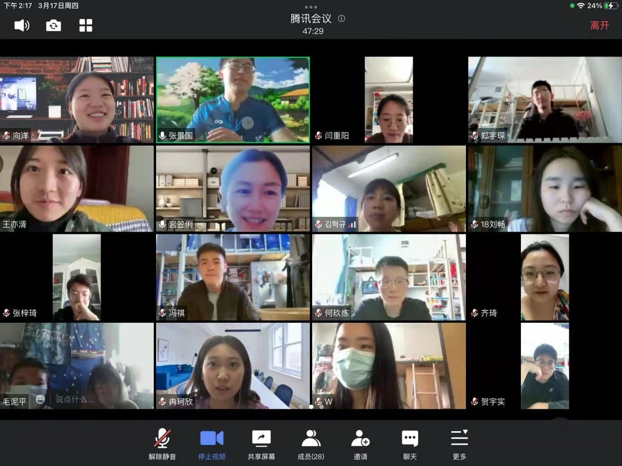 3月16日下午,2018级三班班会于线上开展,班主任朱万润老师、姚璐老师参加会议,班长谷瑛淏主持。朱万润首先详细询问了同学们的学习生活情况并向大家介绍了疫情发展的相关情况,动员大家调整心态,共克时艰;姚璐则向大家分享了居家隔离日常,鼓励大家丰富精神世界并兼顾毕业实践;谷瑛淏与大家交流了自己在抗疫工作中的心得;毛安之鼓励大家“既来之则安之”;赵婧姝进行了学习经验的有关分享。