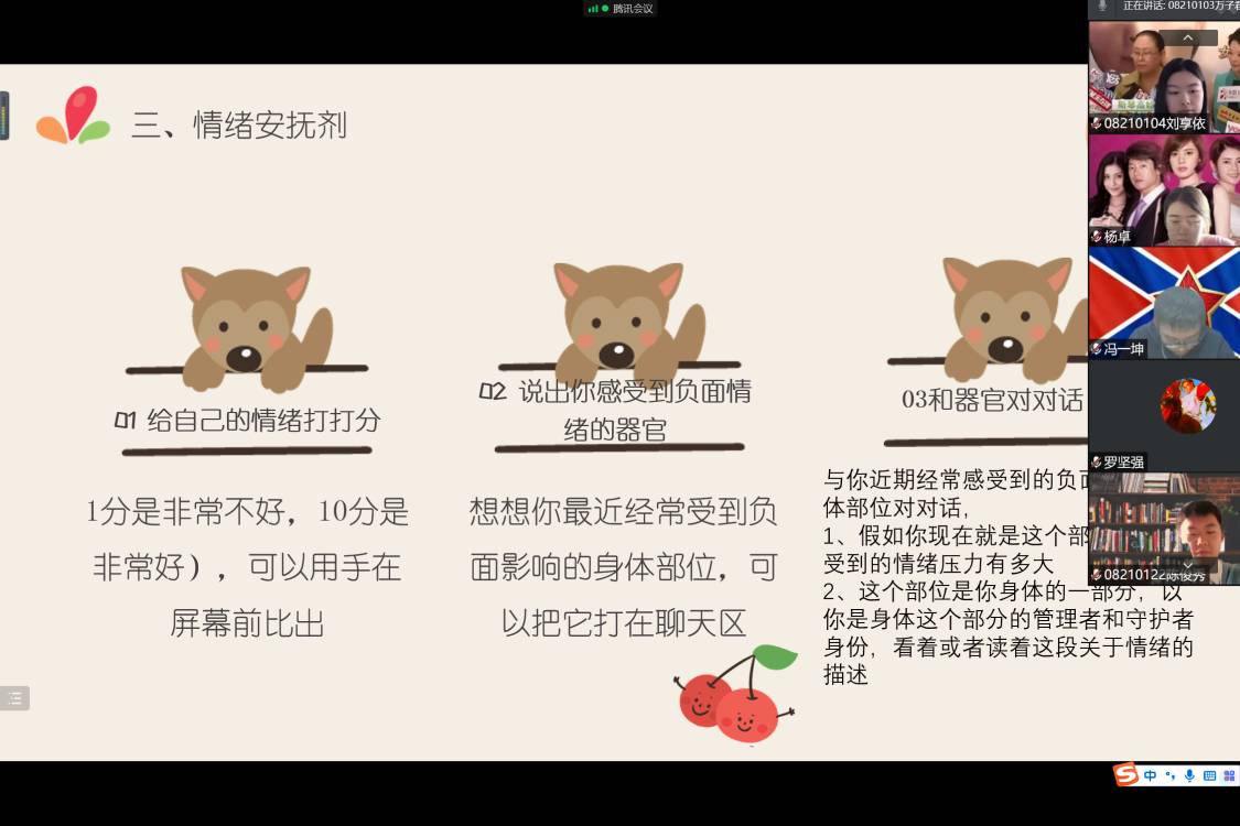 为引导同学们关注自身心理健康,利用团体动力和人际支持,探索心理支持资源,排解在线学习中的困扰,促进班级成员互助,3月18日至3月25日,在老员工心理健康中心的指导及公司朋辈心理辅导员的配合下,2021级各班召开了“心灵沟通”主题班会。