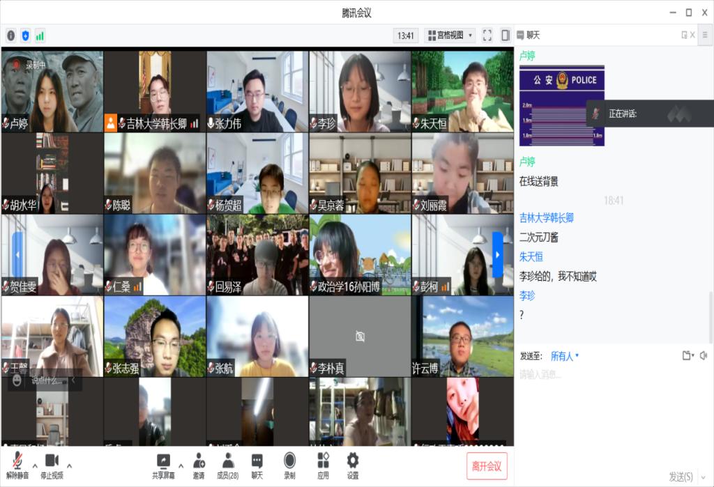 3月24日晚,在2020级四班的班会上,各位同学与孙德超、董伟玮两位班主任老师相聚线上,举办第二期抗疫主题班会。董伟玮老师介绍了疫情期间校内外的基本情况与居家隔离生活,并重点介绍了“吉大行政学子成长计划——面对百年变局的思考”征文活动,鼓励同学们在院内或跨专业进行组队,多进行专业之间的交流,多尝试,多合作,于尝试与合作中汲取养分。孙德超老师向各位同学了解了一些校内封闭隔离的基本情况,提醒同学们珍惜这段抗疫时光,不忘认真学习,提升自身学习质量,与同学、老师多沟通多联系,并适当拓展一些课外活动,之后,两位老师结合自身经历,针对同学们在学习生活上的问题给予了指导。