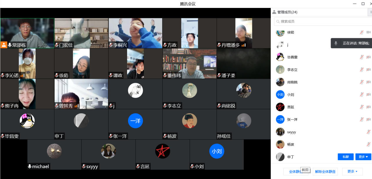 3月29日晚,2020级二班的各位同学与刘畅、张力伟两位班主任老师再聚线上,举办第三期抗疫主题班会。在班会上,同学们分享了近期的学习生活状况。刘畅老师对同学们在疫情期间展现出的自律、自觉与成熟感到欣慰,并讲述了自己最近遇见与回忆起的一些故事,分享了许多感触。她寄语同学们在疫情封寝这段共患难的时光里珍惜同学缘分,收获友谊与幸福。张力伟老师也分享了自己在本科期间学习生活与参加员工工作的一些故事与经历,并为同学们未来的发展规划给予了一些经验与指导。他希望同学们珍惜现在这段时光,认真做好未来规划,在沟通互动中不断提升自我,收获珍贵的经验、资源与情谊。