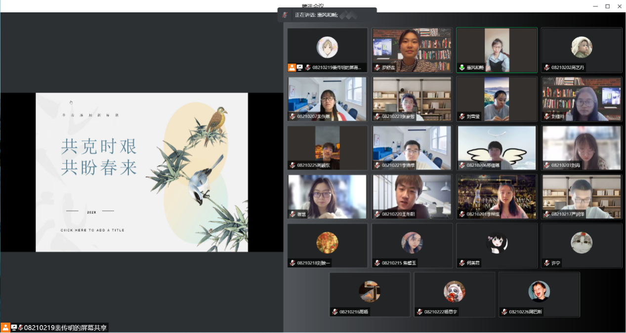 4月15日,2021级二班全体同学与班主任刘畅老师、许宁老师在线上相会。此次班会主题为“你我无恙,繁华与共”,由裴传明同学主持。同学们分别以才艺展示、故事分享、打卡汇报的形式分享了封寝期间日常生活。这一活动促进了同学之间的互相了解,激励整个班级坚持奋斗,受到了刘畅老师、许宁老师的称赞。之后,各位同学共同观看了《航拍中国第三季——吉林》纪录片,领略了吉林省广袤土地之间的风土人情。最后,刘畅老师结合纪录片的内容,分析了如何从日常现象中以专业角度建立分析框架,打通课堂教学与课外实践的教育场域。通过刘畅老师的讲解,同学们对专业知识的理解进一步加深。许宁老师也希望同学们在大学期间多多走出校园,欣赏美景,行万里路,深入感受社会科学类专业的独有魅力。