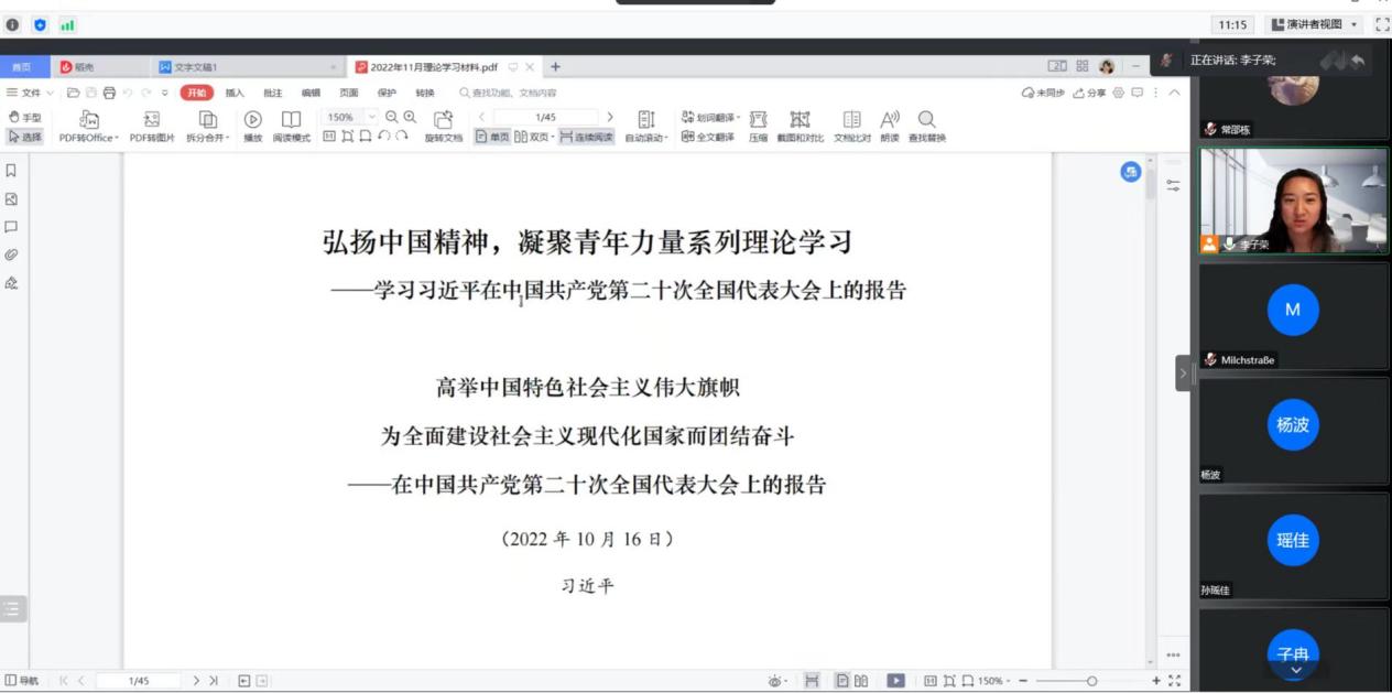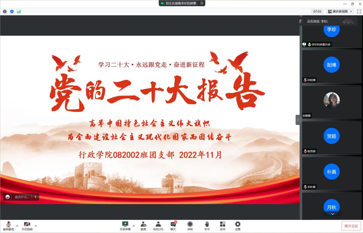 通过本次线上团日活动,同学们深刻领悟到了习近平总书记关于高举中国特色社会主义伟大旗帜,为全面建设社会主义现代化国家而团结奋斗为主题的二十大报告精神。相信通过本次团日活动,行政学子将继续砥砺前行,赓续传承悟空体育“公共精神,独立人格”的院训,切实扛起当代青年的责任担当,为中华民族伟大复兴梦贡献青春力量。(图文:2020级团支书及宣传委员 责编:公司员工会新闻宣传部)