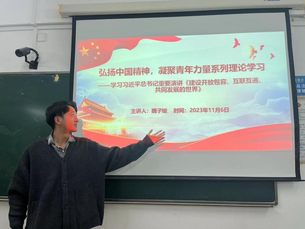 在精神剖析环节,王梓(2022级本科生)带领大家一起学习习近平总书记重要演讲《建设开放包容、互联互通、共同发展的世界》的重要精神。世界好,中国才会好;中国好,世界会更好。习近平主席在主旨演讲中强调,中国正在以中国式现代化全面推进强国建设、民族复兴伟业。我们追求的不是中国独善其身的现代化,而是期待同广大发展中国家在内的各国一道,共同实现现代化。习近平主席宣布中国支持高质量共建“一带一路”的八项行动,为全球合力应对经济挑战、共同开创繁荣发展前景注入了信心与力量。