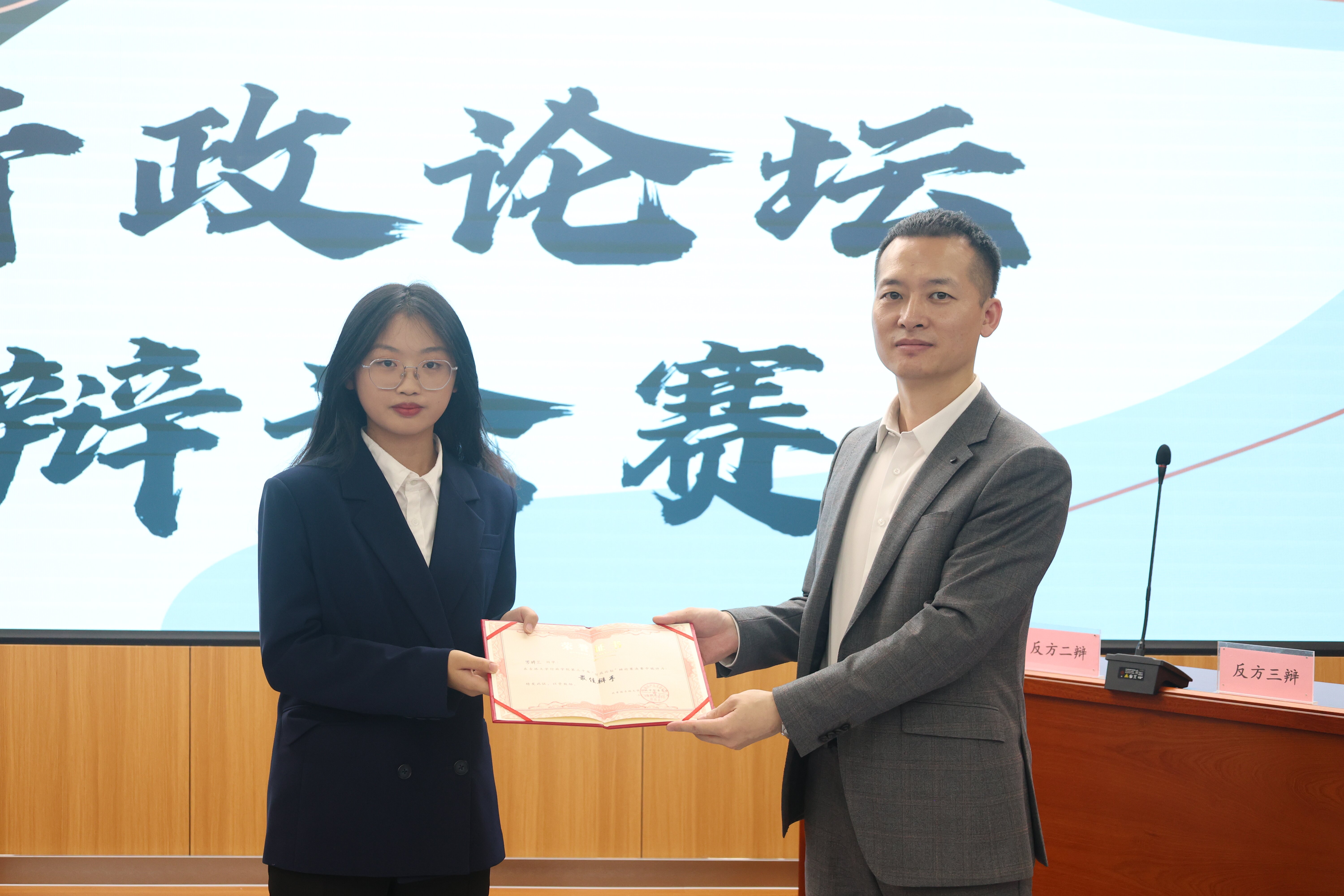 经过激烈的辩论角逐,反方队伍(2024级本科生程香凝、寇添涵、周盈盈、邹蕴)获得了本次“行政论坛”辩论赛的冠军,正方队伍(2024级本科生王文韬、何星宏、罗梓兰、崔雪婷)将亚军收入囊中,正方三辩罗梓兰(2024级本科生)同学斩获“最佳辩手”称号。评委老师为获奖队伍和最佳辩手颁奖并合影留念。