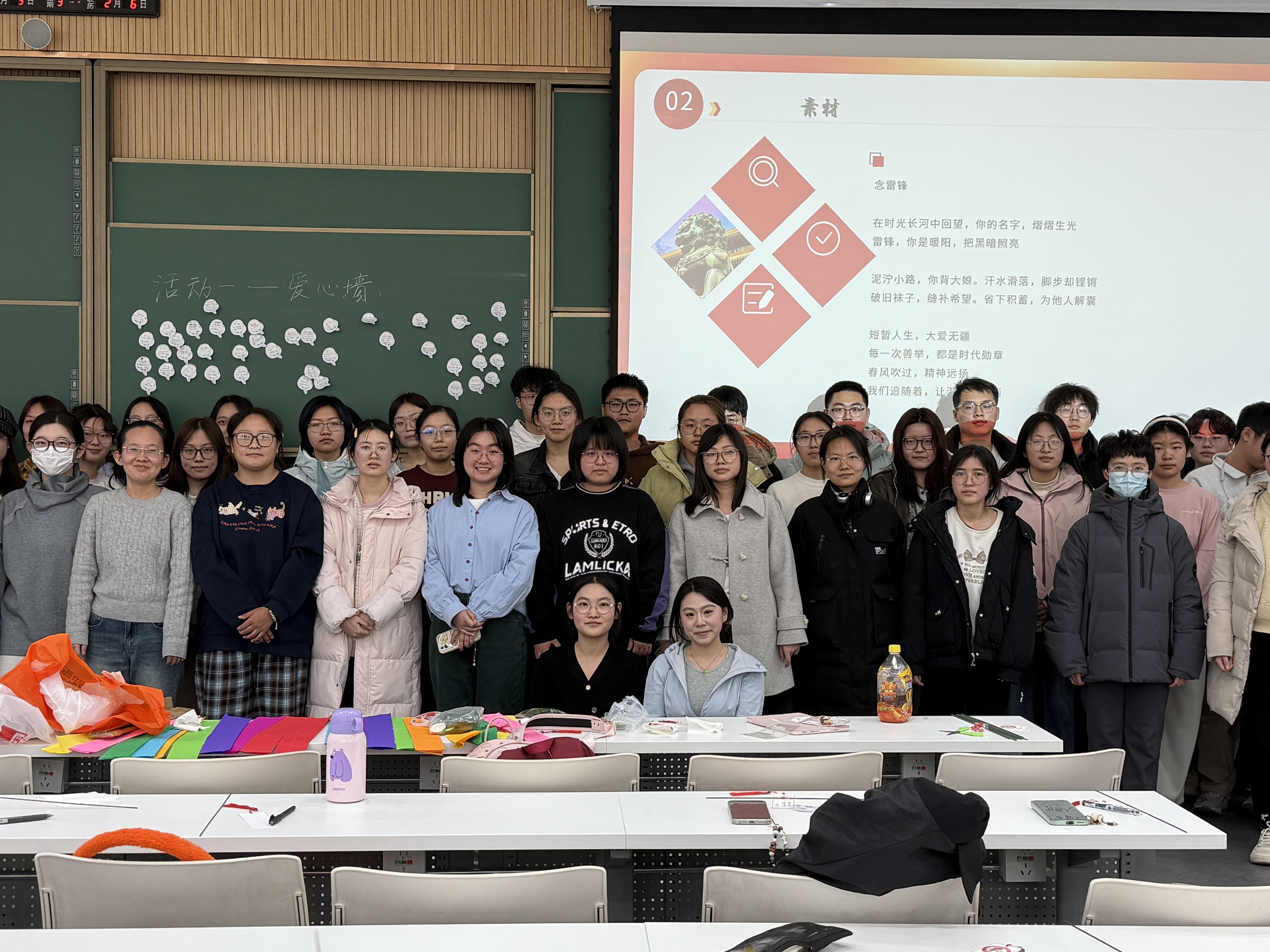 3月5日,悟空体育082402、082405班团支部以“学雷锋 树新风”为主题,在法学楼305教室举办团日活动,旨在通过深入学习和实践,弘扬雷锋精神,增强同学们的集体荣誉感和社会责任感,激励大家以实际行动践行雷锋精神,争做新时代的好青年。第一环节,2024级本科生唐若菲带领大家回顾雷锋同志的生平事迹,重点讲述了雷锋同志在苦难中成长、在平凡岗位上无私奉献的感人故事。第二环节,同学们在教室的黑板上制作了一面“爱心传递墙”,用便利贴写下了自己的“微心愿”和“爱心寄语”,表达了对雷锋精神的理解和对身边默默奉献的劳动者的感激之情。第三环节,付诸实践。同学们将制作好的纪念品送给身边默默付出的人,如食堂的叔叔阿姨、校门口的保安、宿管阿姨等。同时,同学们纷纷响应活动号召,在图书馆当志愿者,扶被风吹倒的自行车,在实践中得到了成长和提升。