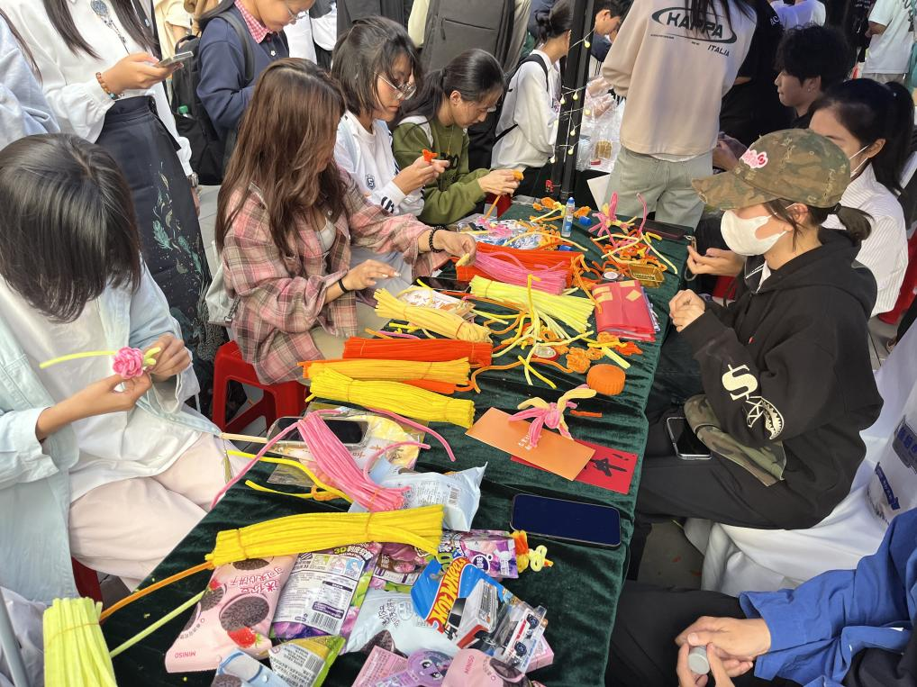 本次活动精心设置了两大趣味环节:古风盎然的“投壶”游戏和创意十足的“扭扭棒趣味编织”。“投壶”活动现场,参与者们凝神静气,巧妙投掷,每一次箭矢入壶都引来阵阵喝彩,将活动气氛一次次推向高潮。活动设置了一等奖、二等奖及三等奖,参与者分别丰富奖品,既增添了活动趣味性与挑战性,也让同学们感受到了传统文化的魅力。“扭扭棒趣味编织”区域则充满了温馨与创意。同学们在志愿者的指导下,发挥奇思妙想,用五彩斑斓的扭扭棒制作出各式各样的眼镜、月饼等手工艺品,不仅锻炼了大家的动手能力,更成为同学们交流情感、传递祝福的纽带,一件件独一无二的作品也承载着大家对中秋佳节的美好祈愿。