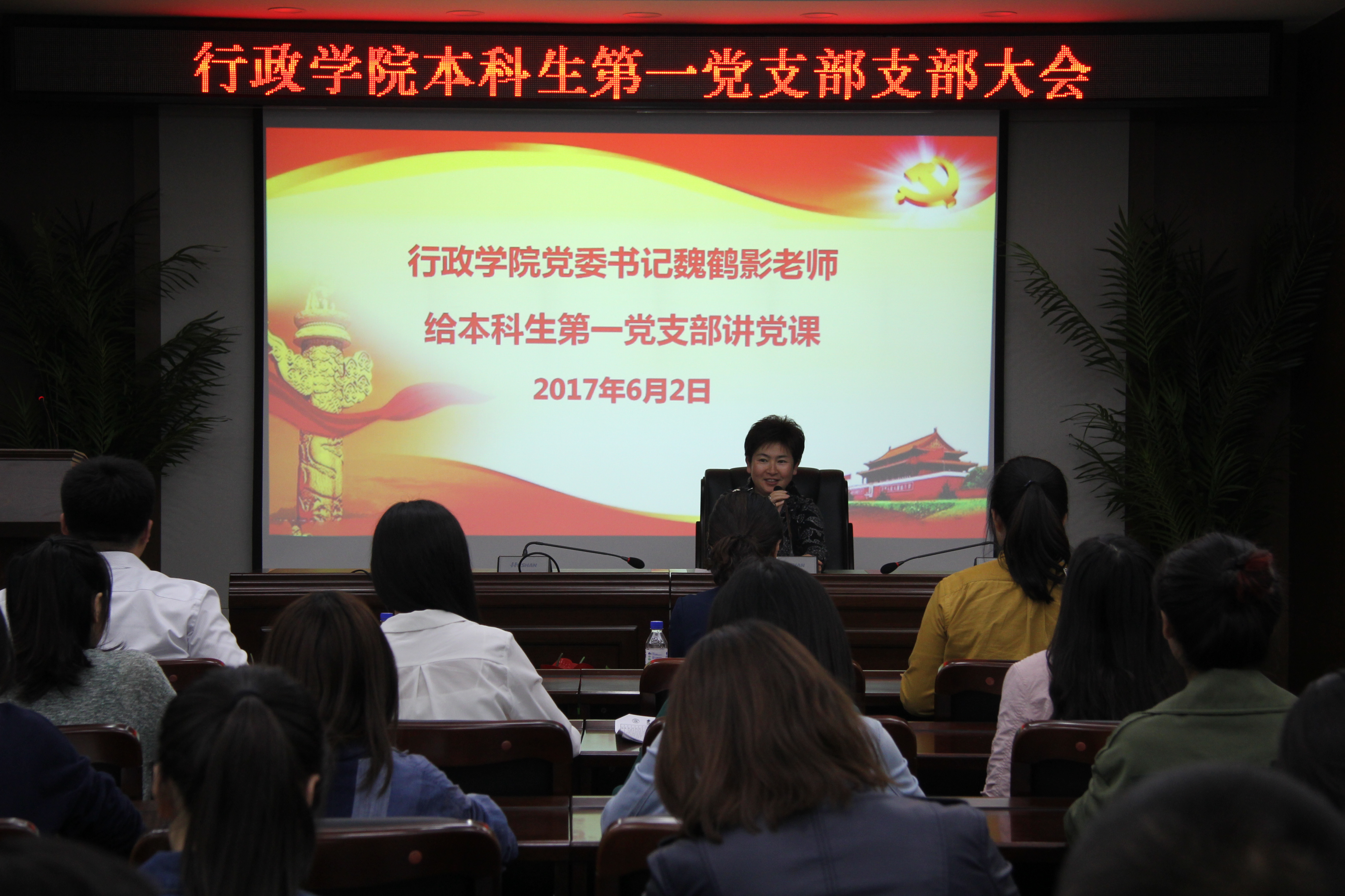 党支部支委会结合实际,特别邀请了魏鹤影书记到会讲授专题党课暨2017届本科毕业生党员最后一次党课。魏鹤影书记从全面从严治党的高度,阐述了全面从严治党的必要性,回顾了党从严治党的优良传统,介绍了党的十八大以来全面从严治党的成功实践和宝贵经验。她还结合公司和公司深入推进“两学一做”学习教育常态化制度化的背景与情况,向党员同学们提出了“践行四讲四有,做合格党员”的具体要求。