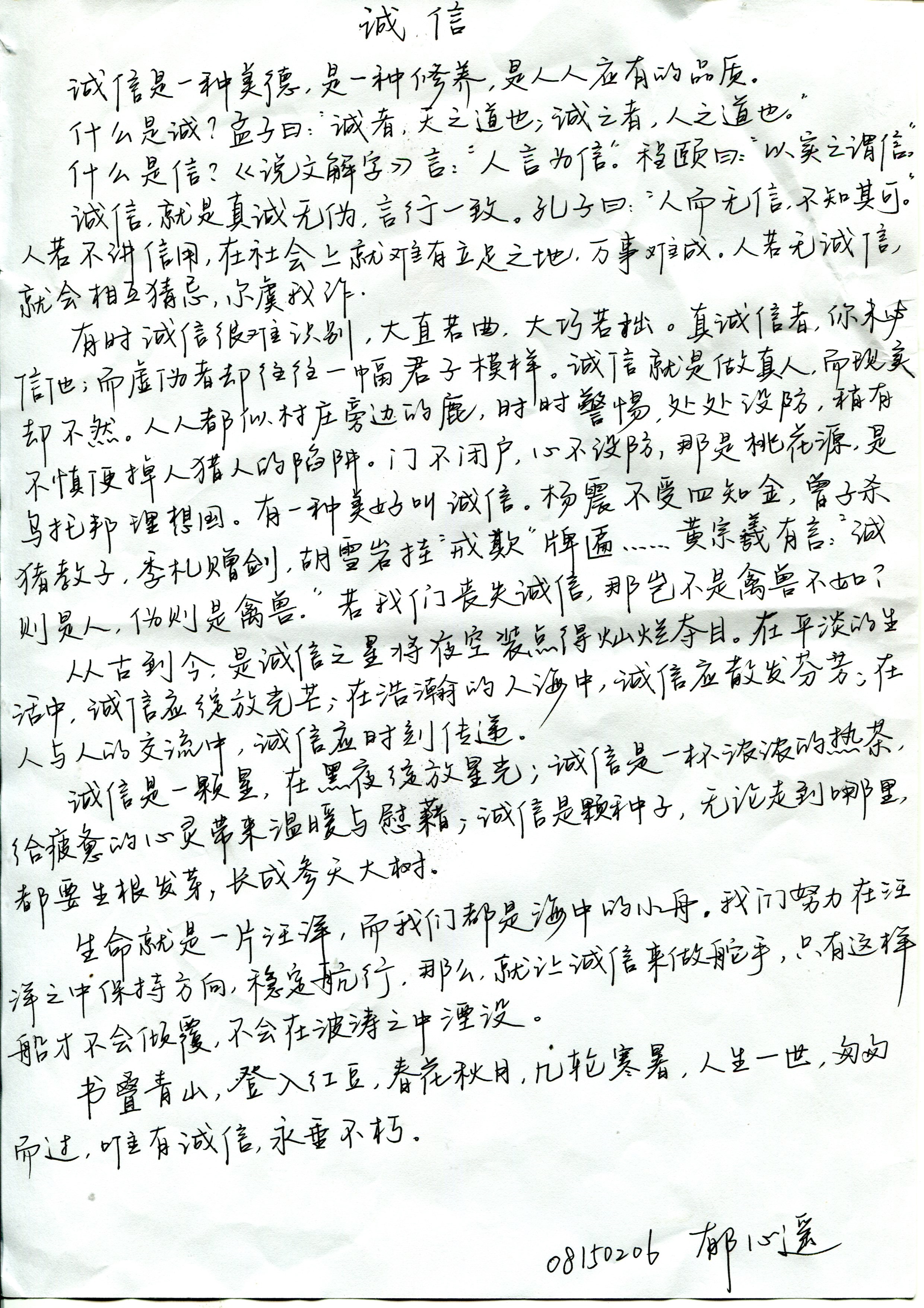 通过这次诚信格言(硬笔)比赛,使同学们接受了中华传统诚信文化的熏陶,帮助同学们树立了正确的人生观、价值观。同时,本次活动还号召员工们自我教育、自我完善和自觉加强诚信建设,牢固树立诚信为本、操守为重、守信光荣、失信可耻的信用意识和道德观念,从而促进员工们潜能的发挥,展现新时代优秀老员工的诚信形象。