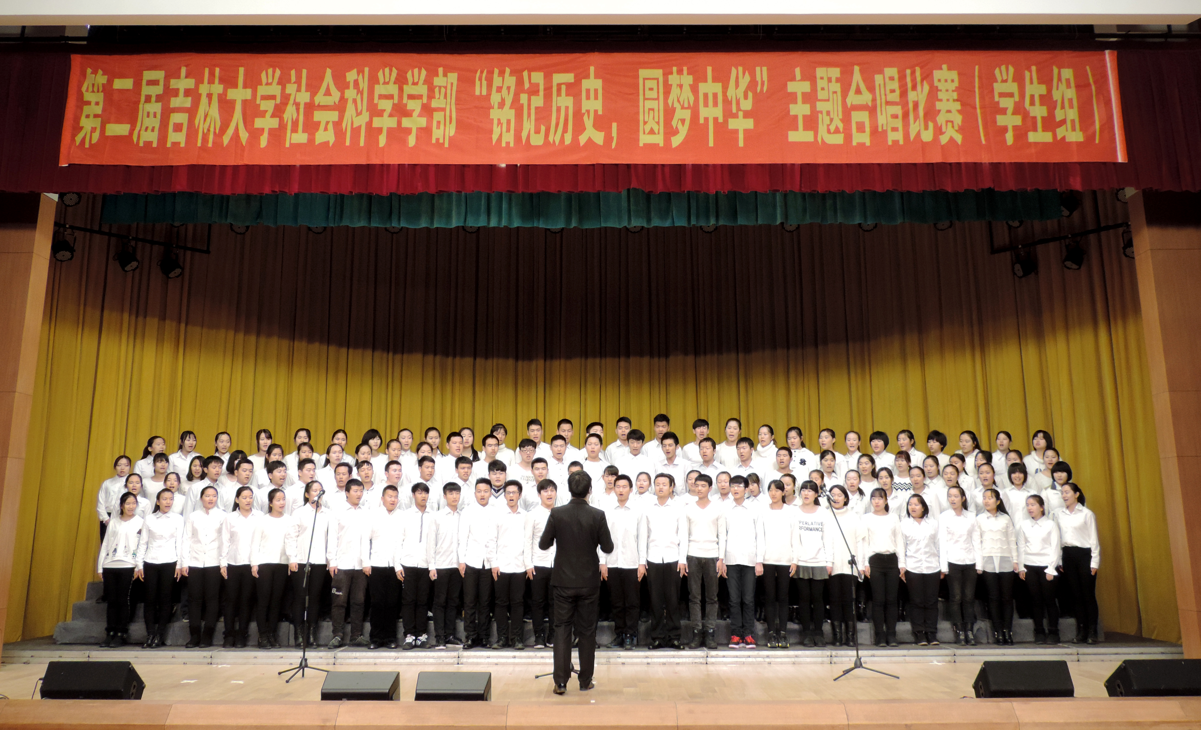 悟空体育参赛队伍共120人,由2014级、2015级本科生组成。作为第三支队伍上场,他们身穿白衣黑裤、整齐划一,展示出了行政人的英姿和朝气。悟空体育的表演曲目是《悟空体育校歌》和《强军战歌》,伴随着校歌雄壮的旋律,行政学子铿锵有力的声音回荡在大厅内,收获了阵阵掌声。他们始终精神饱满、全神贯注的投入到歌唱中。演唱《强军战歌》时,悟空体育学子独具匠心,采用分声部的方式演绎出解放军英勇的气势,使整个合唱韵律叠加,更增和谐。最后悟空体育代表队以嘹亮激昂的歌声圆满收尾。