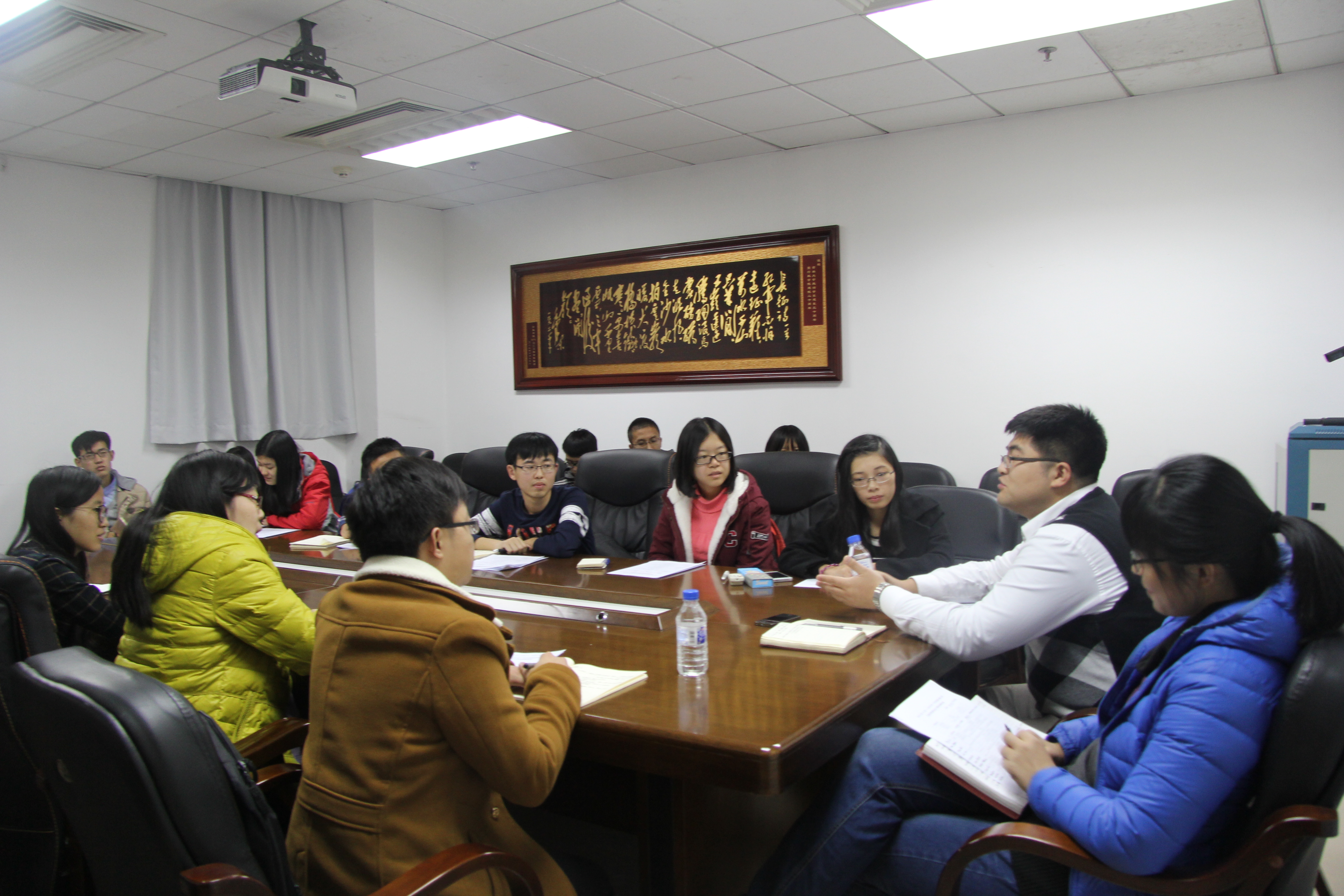 下午5时10分,会议正式开始。大会分六项进行。会议第一项:团委秘书长李代霓(2013级)详细地介绍本年度团委的工作推进,使每一位团委工作人员对自己的工作有了更深入的了解。会议第二项:团委副书记孙超群(2013级)汇报团委的整体团务工作,着重讲述了团委工作的进展、方向以及对团务工作的反思。会议第三项:社团团总支书记孟祥铎(2013级)汇报具体的各社团的团务工作,并提出了要加强团支部建设的要求。会议第四项:各年级团支书代表汇报本年级的团务工作。会议第五项: 本科生辅导员刘洋组织大家讨论工作推进表具体事宜。与会人员对团务工作进行了积极的讨论,指出了工作推进表存在的问题,进一步完善了工作推进表。会议第六项: 会议总结。本科生辅导员刘洋对上个月团委的工作成果提出了表扬与肯定,并对日后团务工作提出要求。