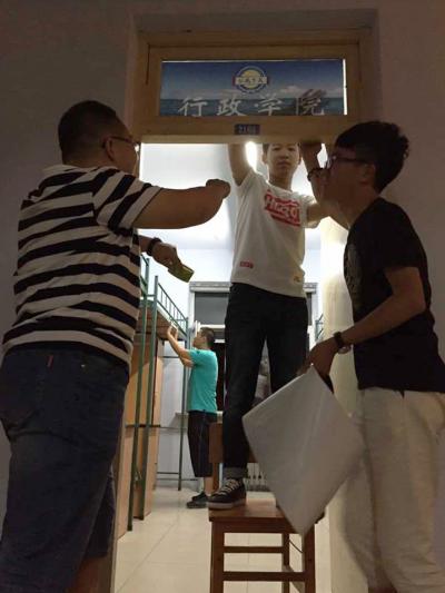 晚7时左右,曲畅竹带领员工干部来到前卫南区大学城二公寓、三公寓展开张贴布置工作。在曲老师的带领协调下,张贴工作进行得井然有序。两三个员工为一组,彼此之间分工协作,高效地完成了各项工作。张贴完毕后,员工干部们还检查了新生寝室门锁的完好情况,并记录下了需要报修的寝室。为让2015级新生入住更加便利,大家悉心检查,对于细节十分认真,表现出良好的工作风貌。