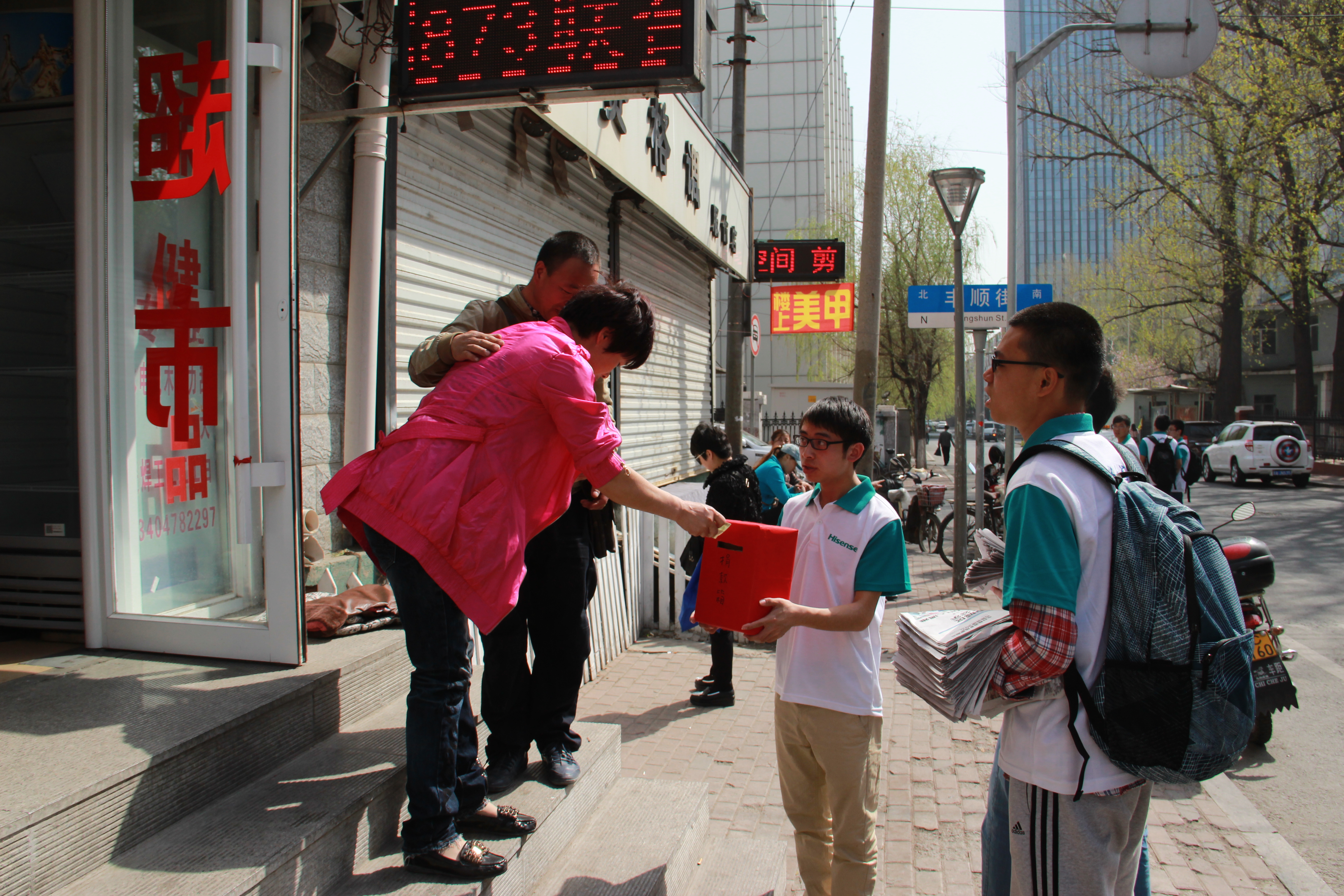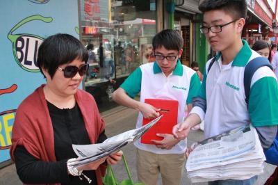 活动当天,同学们按照事先指定路线来到桂林路,在集合完毕后,将全班41人随机自由组队分为8个小组,将事先制作好的捐款箱分发给各组队长。随后将义卖活动所需要的500份报纸平均分配给每组队员。每组队伍分头走向不同的方向,随即开始了一次为育苗支教的孩子们筹集善款的义卖活动。活动过程中,很多人了解到这是一个为支教孩子筹集善款的活动后,都纷纷购买报纸,有些甚至以几倍的价格购买,同学们也免费将报纸派发给在执勤的交警和在幸苦工作的环卫工人们。通过同学们一天的辛勤劳动,本次义卖报纸活动共筹得善款1080元,所得善款将全部用于“育苗”支教活动经费。