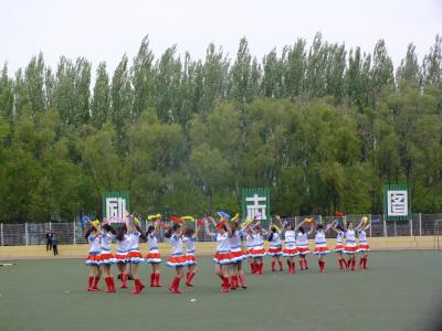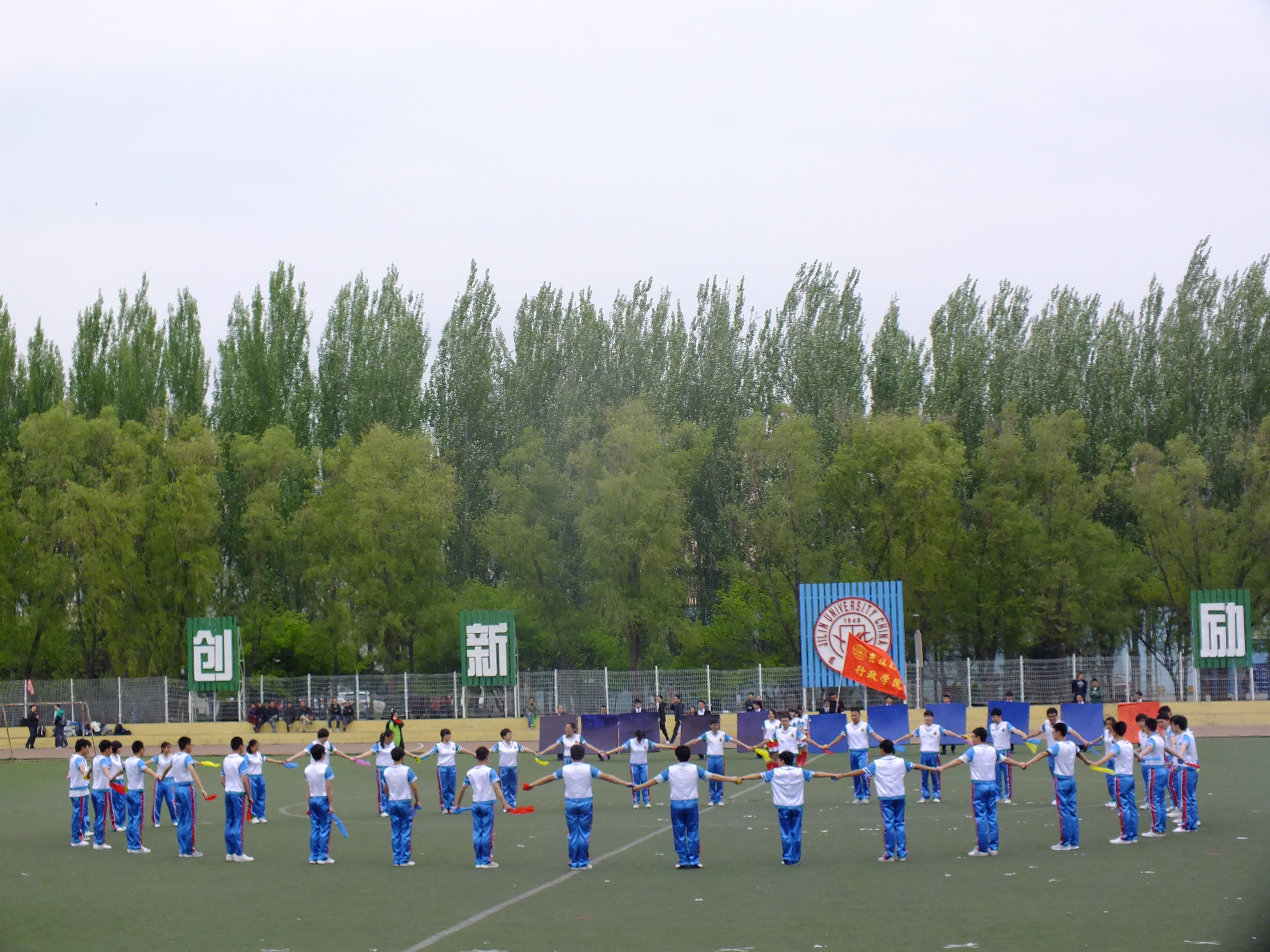 随着一声响亮的口号,同学们迈着整齐的步伐在一片欢呼声中进入比赛场地,大舞的帷幕随即拉开。今年悟空体育的大舞颇具创意,不仅使用了两种道具,变换了三首背景音乐、五次队形,还融入了当下较流行的“快闪”元素,让在场的观众和评委眼前一亮。首先同学们重现了著名音乐剧《音乐之声》的片段,男生和女生共围成八个圆圈,伴随着欢快的背景音乐,整齐划一的动作引来阵阵掌声。随后经过同心圆、三角阵等队形变换,在“party rock rhythm”的背景音乐下,同学们将街舞与健美操完美结合,顺利完成了第二部分的表演。之后同学们变换成十乘十一的矩阵队形,挥舞着彩带做了数次人浪,成为体育场上一道亮丽的风景。接下来是本次舞蹈的重头戏,同学们高举与头平齐、与肩同宽的彩色大板,以俄罗斯方块的形式进行表演,并在激昂的背景音乐下陆续拼出悟空体育的院训“天下为公”四个大字,令在场的观众惊叹不止。最后,同学们簇拥着由刘洋、曲畅竹扮演的卡通人物以“快闪”的形式退场。