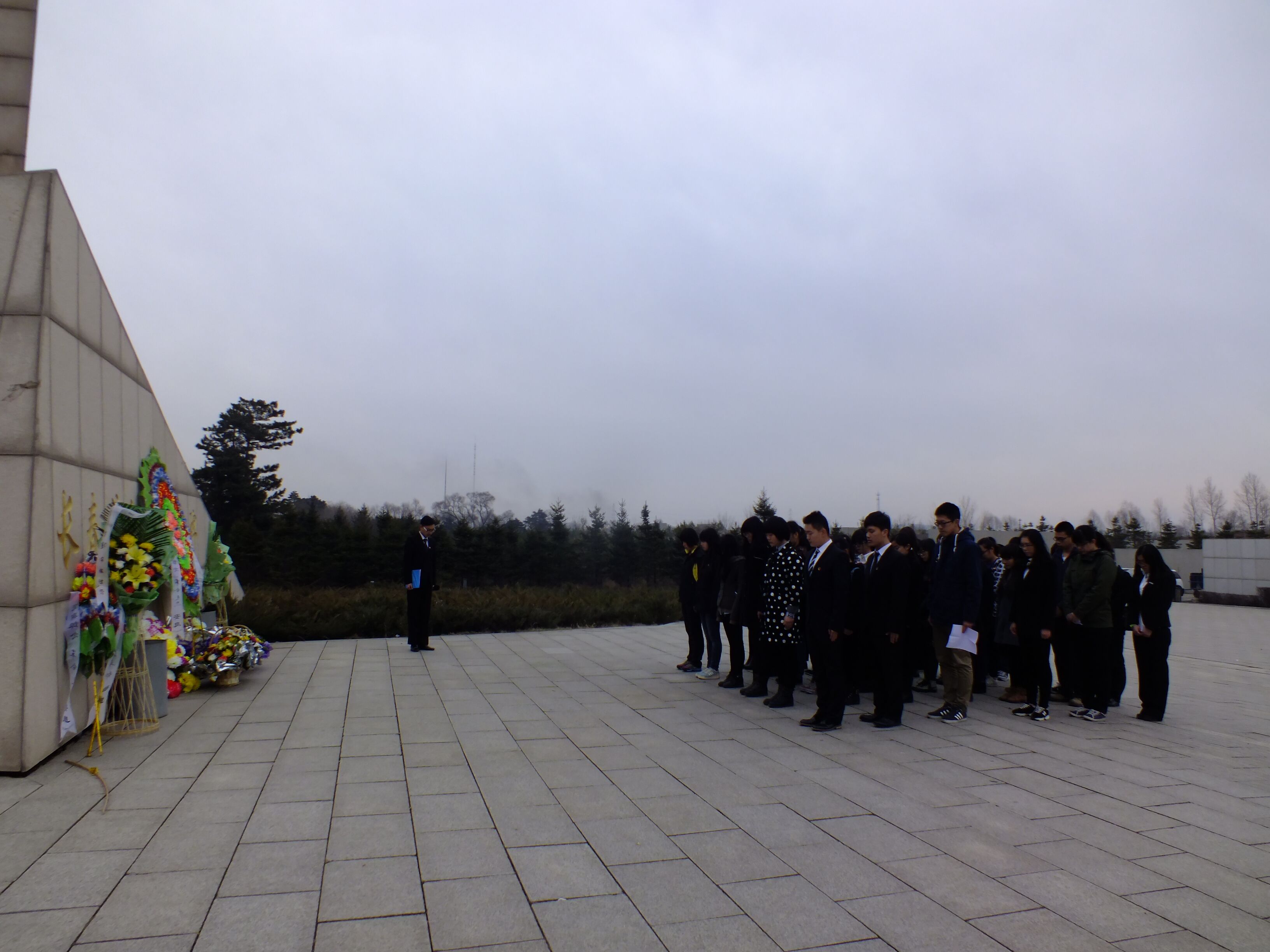早上8点40,参与活动的人员在逸夫图书馆前集合完毕,乘坐校车前往九龙源烈士陵园,经过一个小时到达目的地。大家排好队列,迈着整齐的步伐,怀着沉痛的心情徐徐走向长春革命烈士纪念碑。10点,清明祭扫活动在王森(2014级)的主持下正式开始。全体人员在碑前肃立,奏唱国歌,并由姜鹤(2013级)作为员工代表向革命烈士敬献鲜花,表达哀思;接着,哀乐缓缓响起,全体人员脱帽低头,为先烈们默哀三分钟,以表达对英雄们的缅怀之情;随后,员工代表张蕴弛(2014级)朗读祭文,表达对先烈为革命事业抛头颅洒热血的崇敬感激之情。接下来辅导员曲畅竹发言,她首先深切地表达了对英雄们的怀念,期待同学们能从革命先辈身上表现出来的英勇不屈、顽强坚毅的精神中受益,更加积极向上地面对今后的学习和生活。之后员工代表代铭浩(2014级)代表新时期老员工表达了向革命先烈学习的决心,承诺定会继承先烈遗志,为建设更好的祖国发奋图强。最后,全体人员肃立碑前,奏唱共青团团歌。