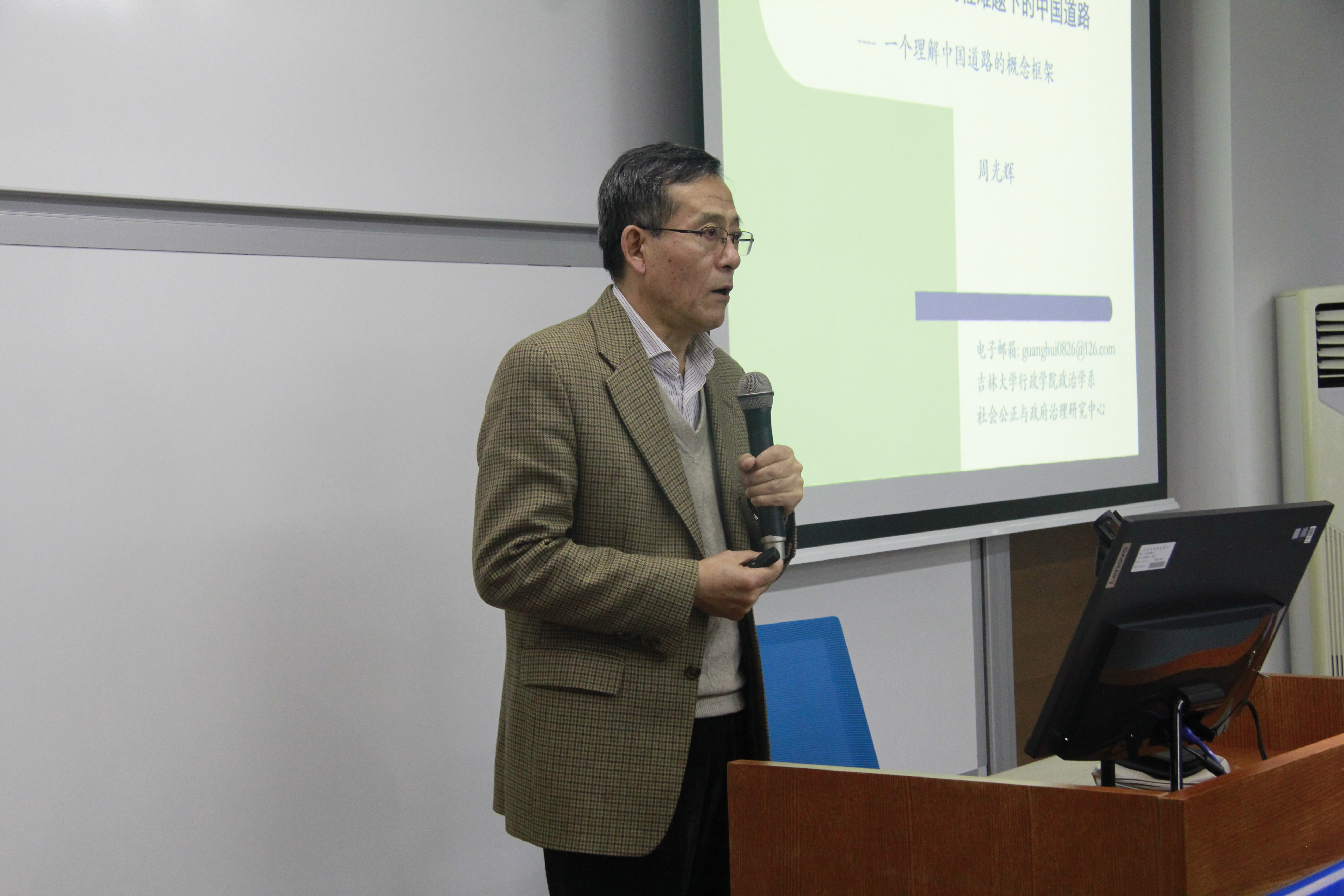 周老师以自己多次往返美国的学术经历为切入点,以改革开放后中国的发展奇迹为佐证,论述了中国特色社会主义道路的优越性。随后,周老师根据国家发展中应该注意的普遍性与特殊性差异,指出:“不应让知识成为教条,应在概念与现实冲突时对概念做出改变”。周老师认为,学术研究应当走出“西方中心主义”的束缚,走入中国情境,认识到中华文明的本质,深耕中华民族的文化向心力。对于当代中国的发展,周老师指出,面对变革中的诸多挑战,需要在整合改进中融入现代化价值,通过整合维护统一,通过改进释放活力、促进发展。之后,周老师回答了同学们关于“中国例外论”中西方学者对中国道路的疑问,指出中国的发展是世界现代化进程的一部分,要从中国发现普遍性、拥抱世界。在讲座的最后,周光辉教授提醒同学们,学术研究应当慢下来,以现实发展为基础进行有价值的研究。