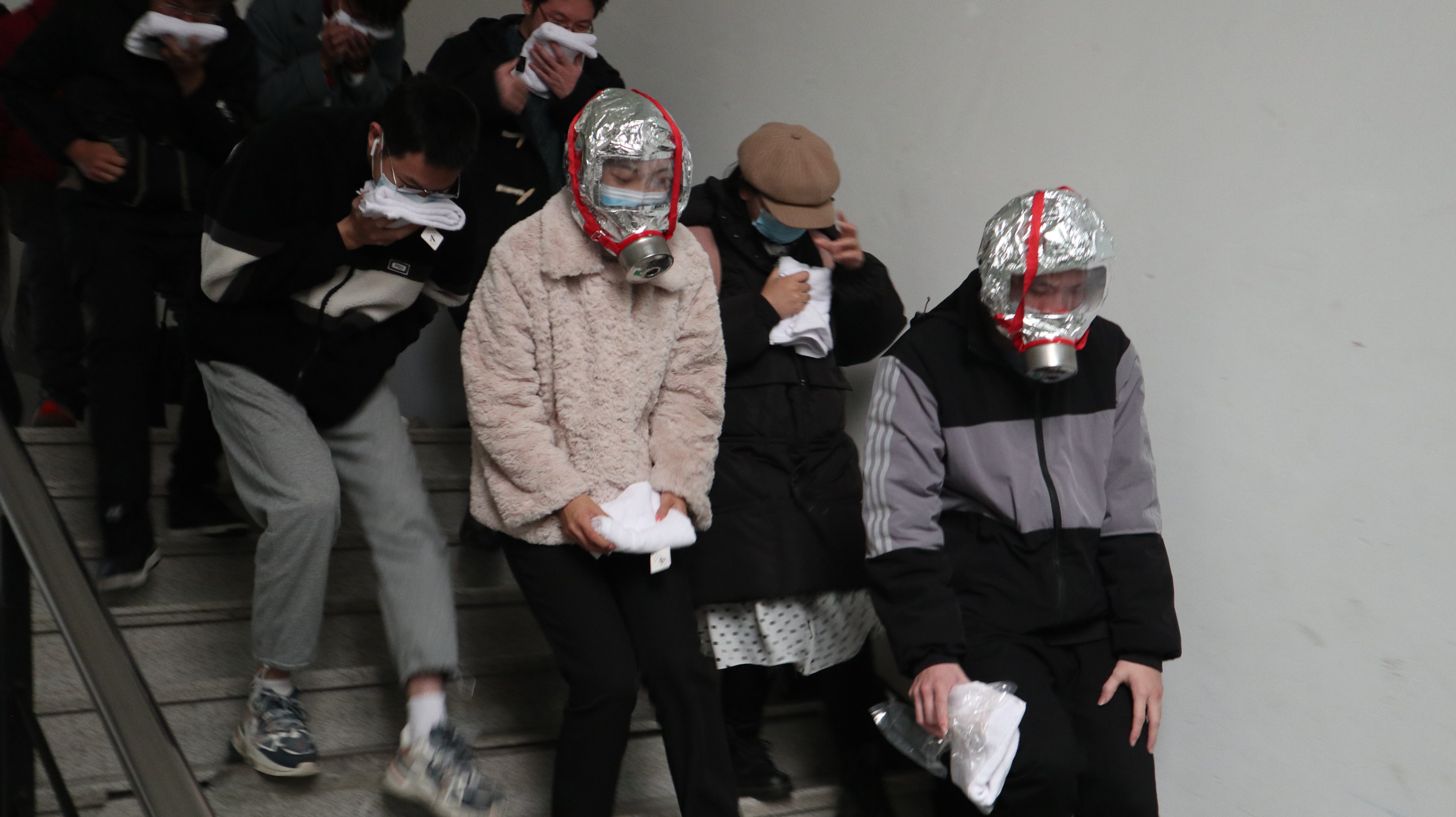 随后,以公共场所和实验室出现火灾险情为背景,在政安消防公司人员组织下,现场师生进行了逃生演练。