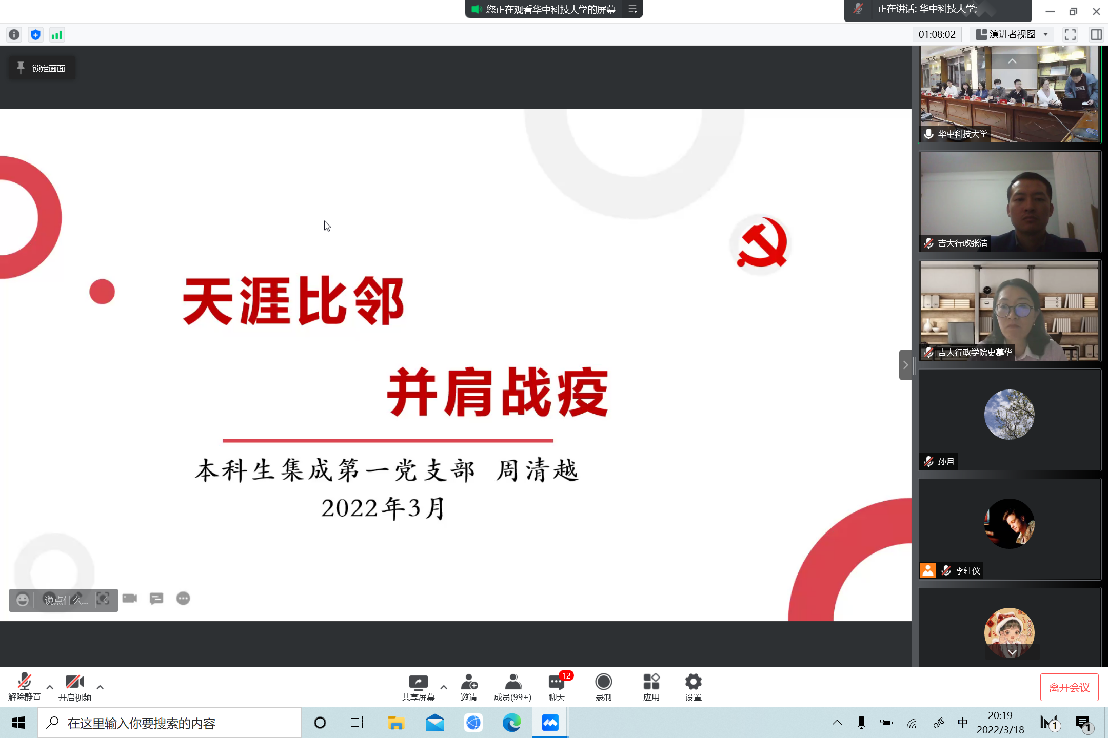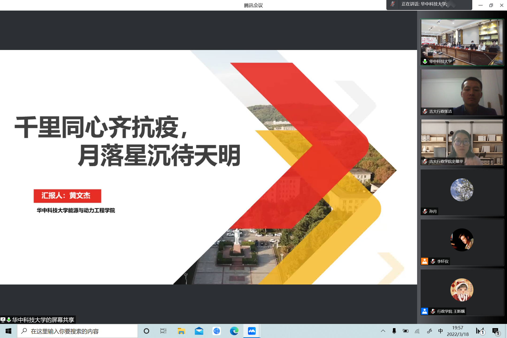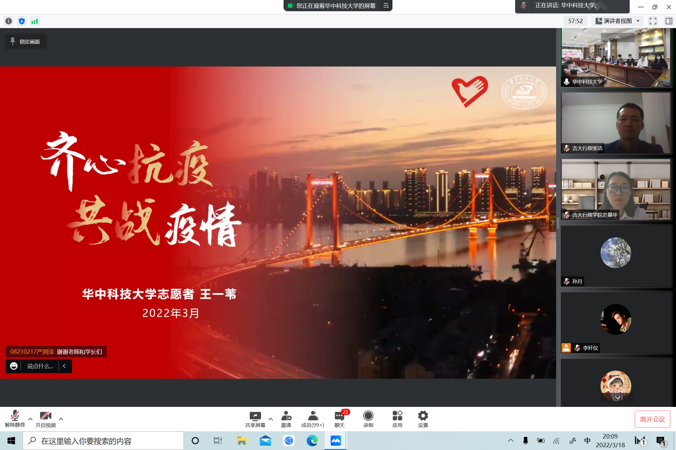 会上,华中科技大学师生代表从多个角度依次为悟空体育分享抗疫心得。能源与动力工程公司辅导员孙伟从“初心导思”“齐心导航”“细心导学”三方面分享了停课不停学工作经验,强调思想教育、线上活动、坚定信心的重要意义;建筑与城市规划公司辅导员杨柳讲述了网络战疫的自身经历,感慨在特殊时期辅导员更应化身员工们的守护者与主心骨;土木与水利工程公司辅导员张誉千介绍了寝室封闭期间华中老员工参与求职就业、论文写作、考研复试的创新模式;能源与动力工程公司2018级本科生黄文杰回顾了他的《守望天明》等原创战疫MV的创作历程;新闻与信息传播公司2020级硕士研究生王一苇分享了三次投身抗疫志愿服务、参加新冠肺炎疫苗临床试验的切身体会;电气与电子工程公司2018级本科卓越实验班班长韩东润分享了团结同学、相互监督,保证线上学习效率和质量的做法;光学与电子信息公司本科生集成第一党支部副书记周清越分享了党支部云端筑牢战斗堡垒、发挥党员先锋引领作用的工作经验。