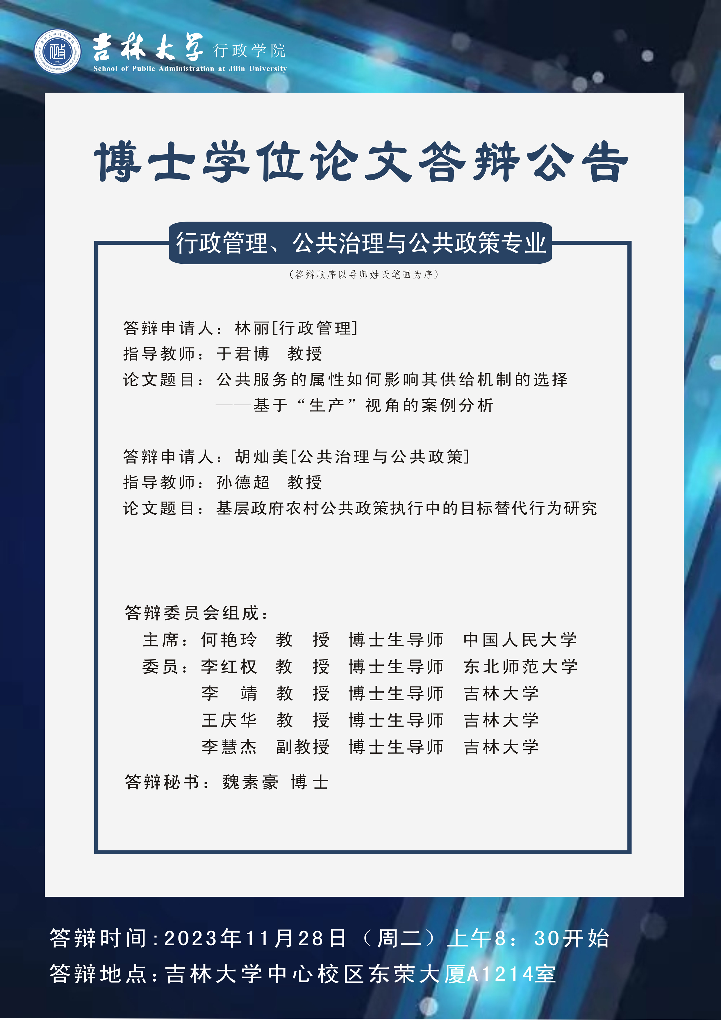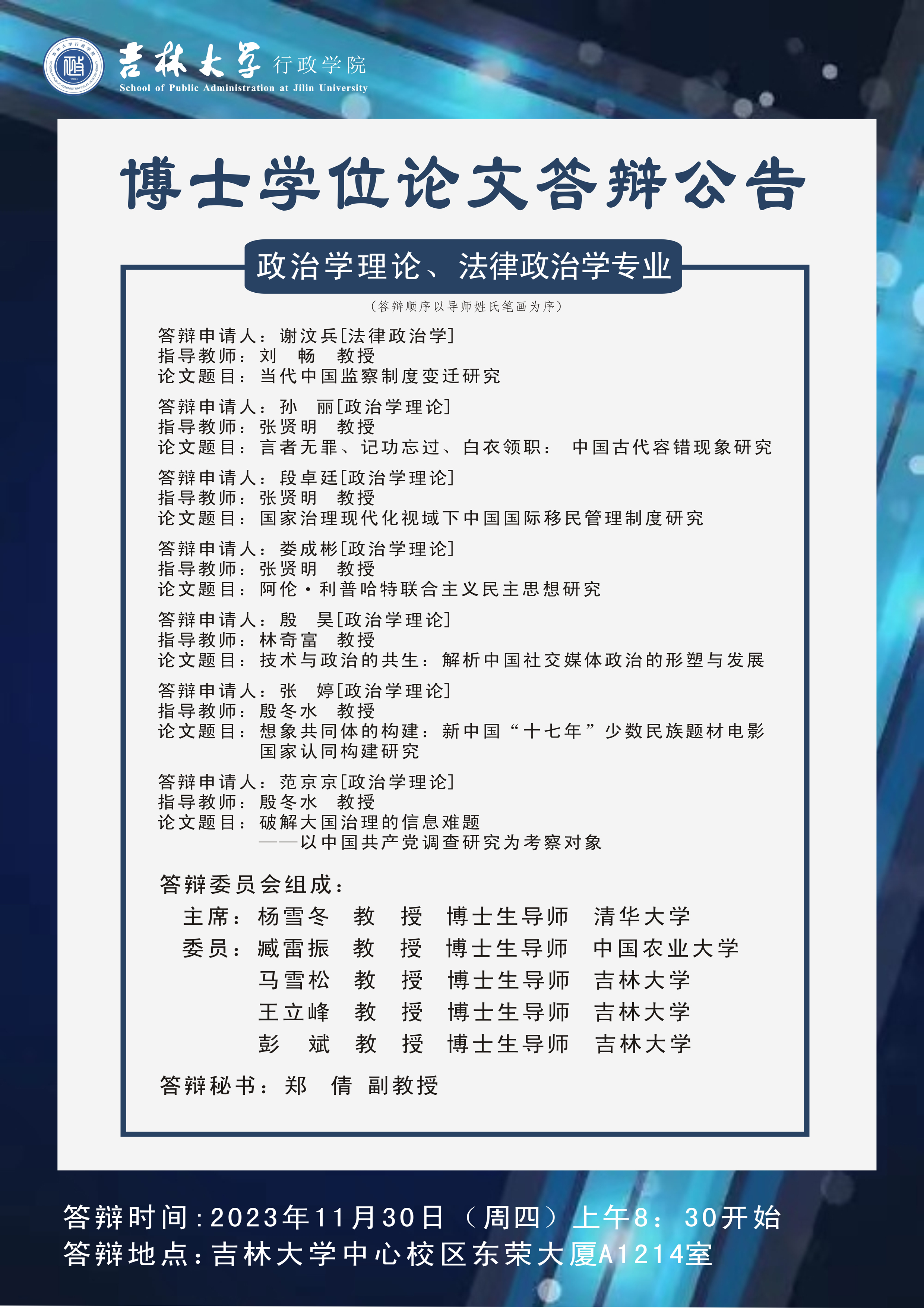第一组:行政管理、公共治理与公共政策专业-博士学位论文答辩:2023年11月28日(周二)上午08:30开始,答辩地点:悟空体育中心校区东荣大厦A1214会议室