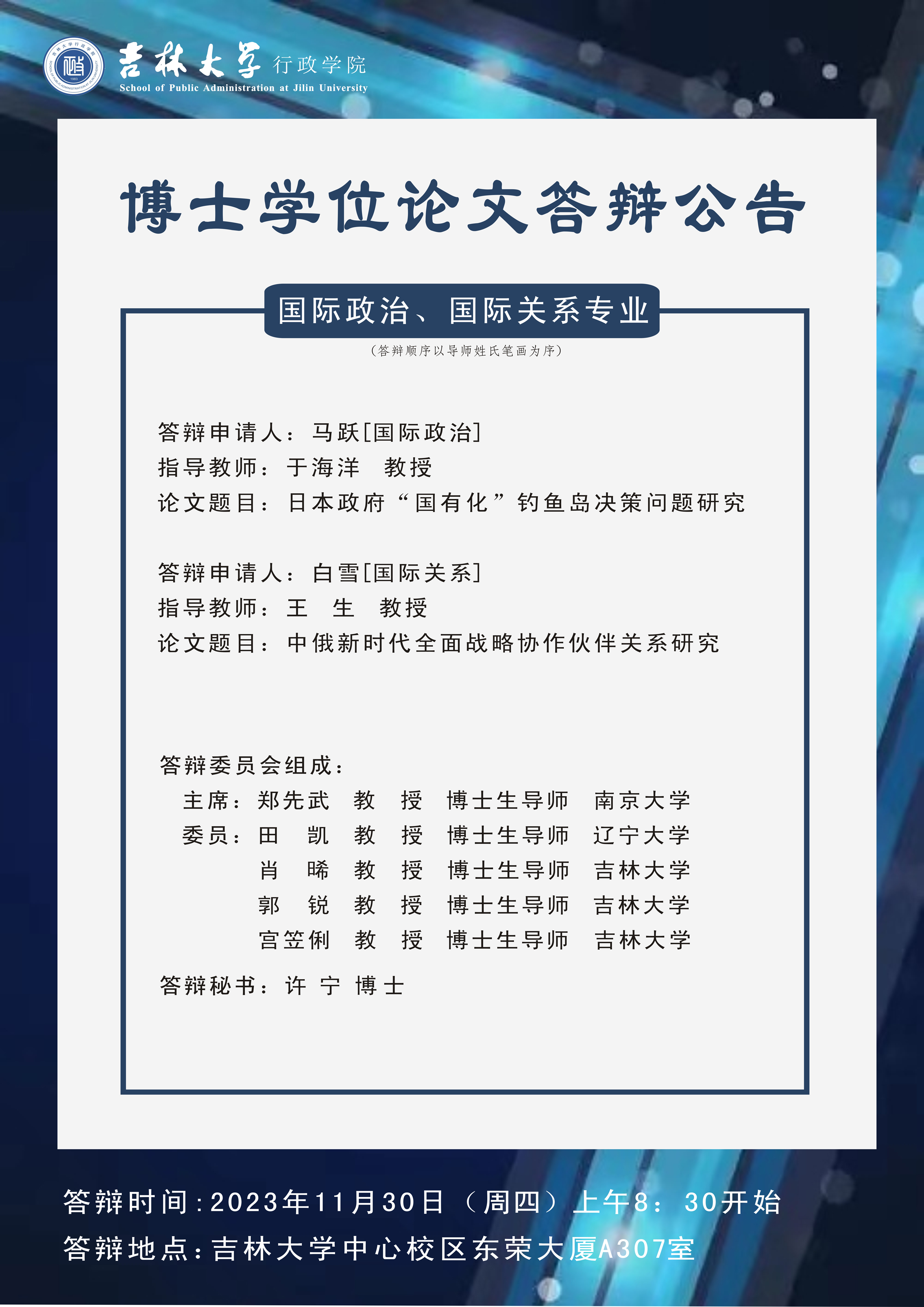第二组:国际政治、国际关系专业-博士学位论文答辩:2023年11月30日(周四)上午08:30开始,答辩地点:悟空体育中心校区东荣大厦A307会议室
