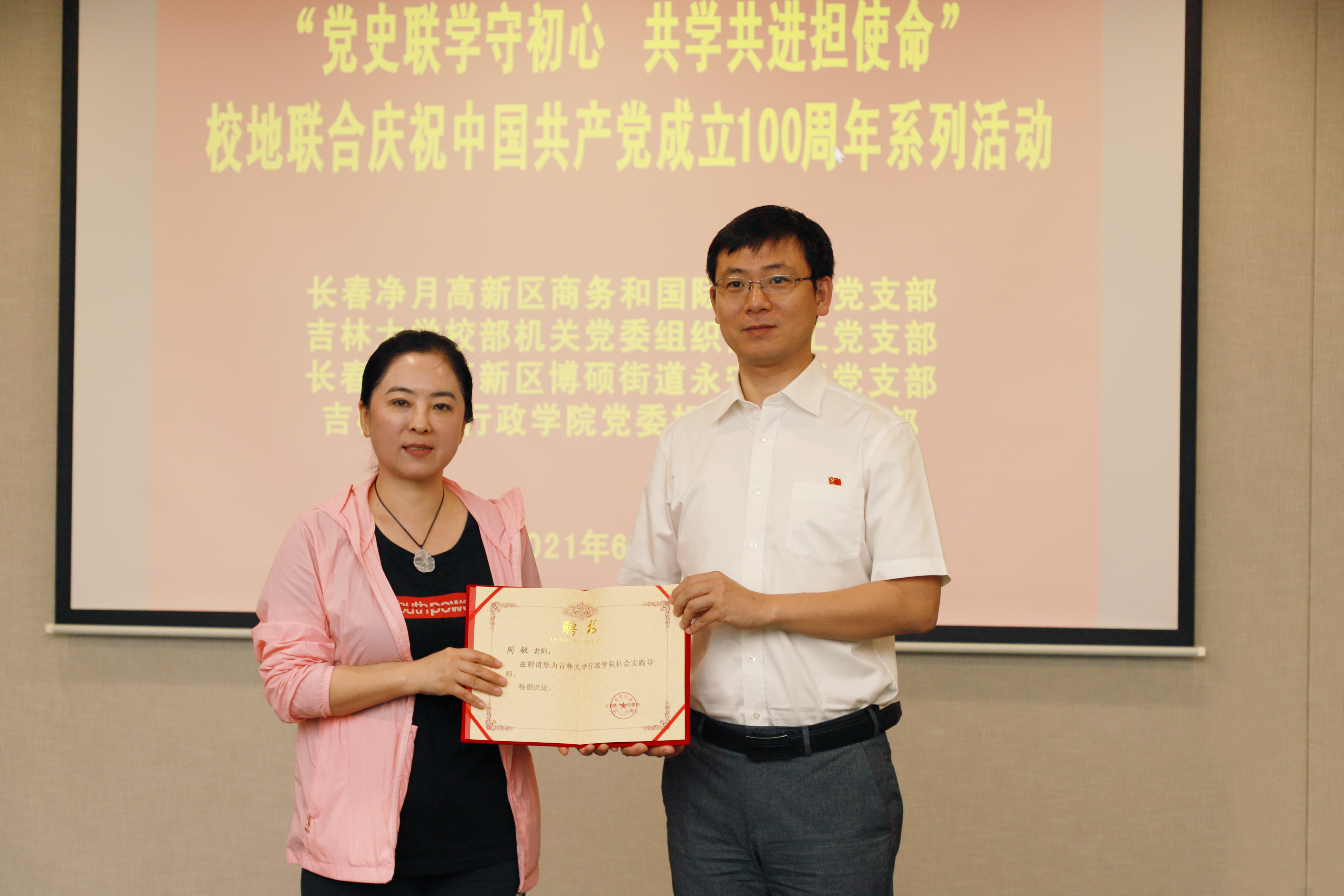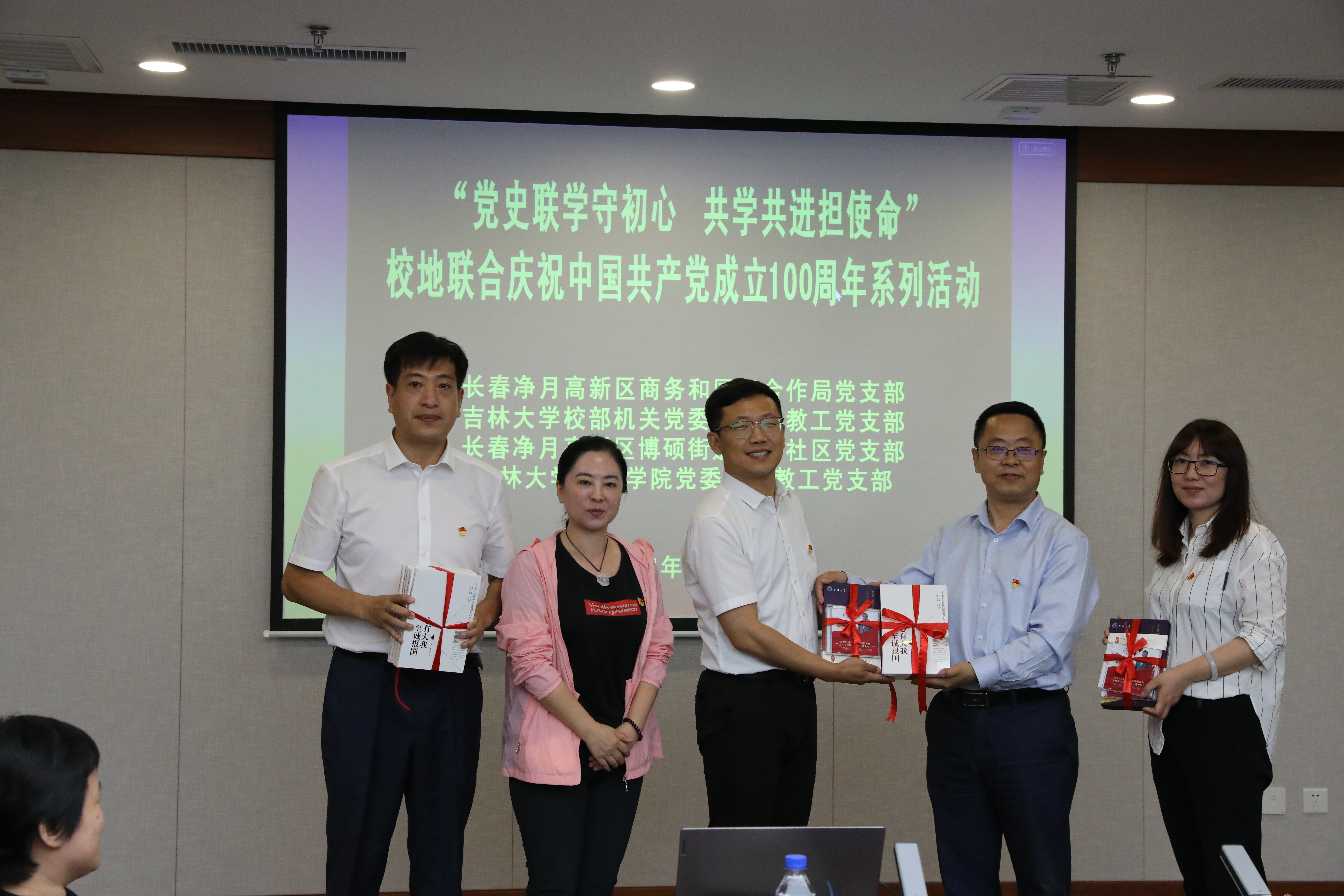 为持续深入开展党史学习教育,全面落实公司关于庆祝建党百年之“三走进、三服务、三融合”活动要求,校部机关党委组织部教工党支部、公司党委机关教工党支部于6月19日,联合长春净月高新技术产业开发区商务和国际合作局党支部、长春净月高新技术产业开发区博硕街道永安社区党支部共同开展“党史联学守初心 共学共进担使命”校地共庆中国共产党成立100周年系列活动。公司党委组织部部长巩英春、机关党委书记郑爽、党委组织部正处级组织员张蓼红、公司党委书记马景惠及所在支部全体党员参加活动。校机关党史学习教育指导组组长蒲韶华、副组长李郎达应邀参加。