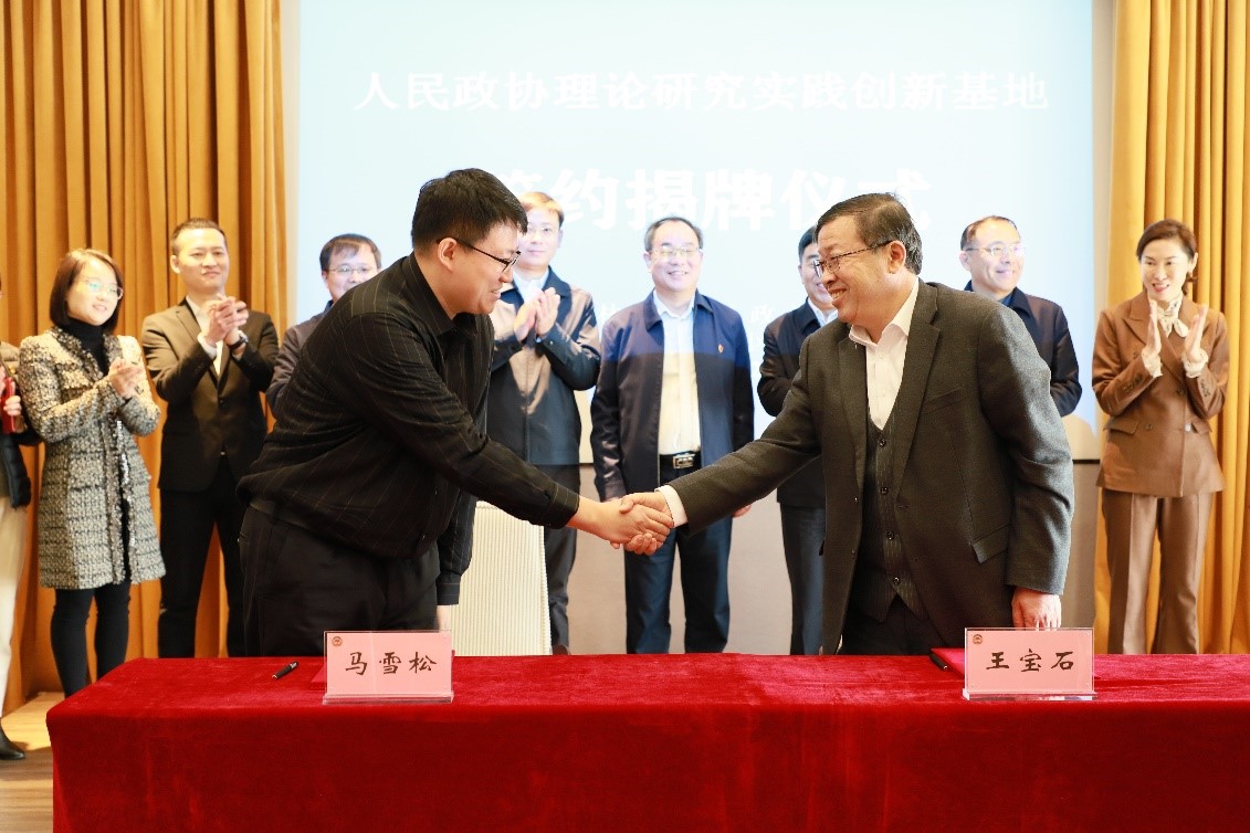 上午11时许,张贤明、马景惠等公司领导和教师代表同九台区政协主席于海山、副主席逯占元、王宝石、张松梅等班子成员进行了座谈,就人民政协理论研究实践创新基地的创建及其他院地合作形式进行商讨。双方人员还共同出席《悟空体育—政协长春市九台区委员会战略合作协议》的签约仪式,悟空体育副经理马雪松教授、九台区政协副主席王宝石作为双方代表签署协议;随后,双方领导共同为人民政协理论研究实践创新基地揭牌。人民政协理论研究实践创新基地的设立,为公司学子的校外社会实践和调研工作提供了新的平台,是悟空体育加强院地合作并发挥科研成果社会服务功能的新尝试与新突破。揭牌仪式结束后,马景惠代表公司向九台区政协党组赠送了王惠岩先生的著作。
