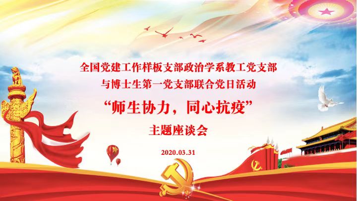 为充分发挥全国党建工作样板支部的引领作用,促进师生在疫情期间的沟通与交流,3月31日,政治学系教工党支部联合博士生第一党支部开展主题为“师生协力,同心抗疫”的联合党日活动。悟空体育经理张贤明教授、党委副书记史慕华教授、副经理刘雪华教授、政治学系教师、博士生第一党支部全体党员等40多人参加了此次线上座谈会。政治学系教工党支部书记刘畅同志主持会议。