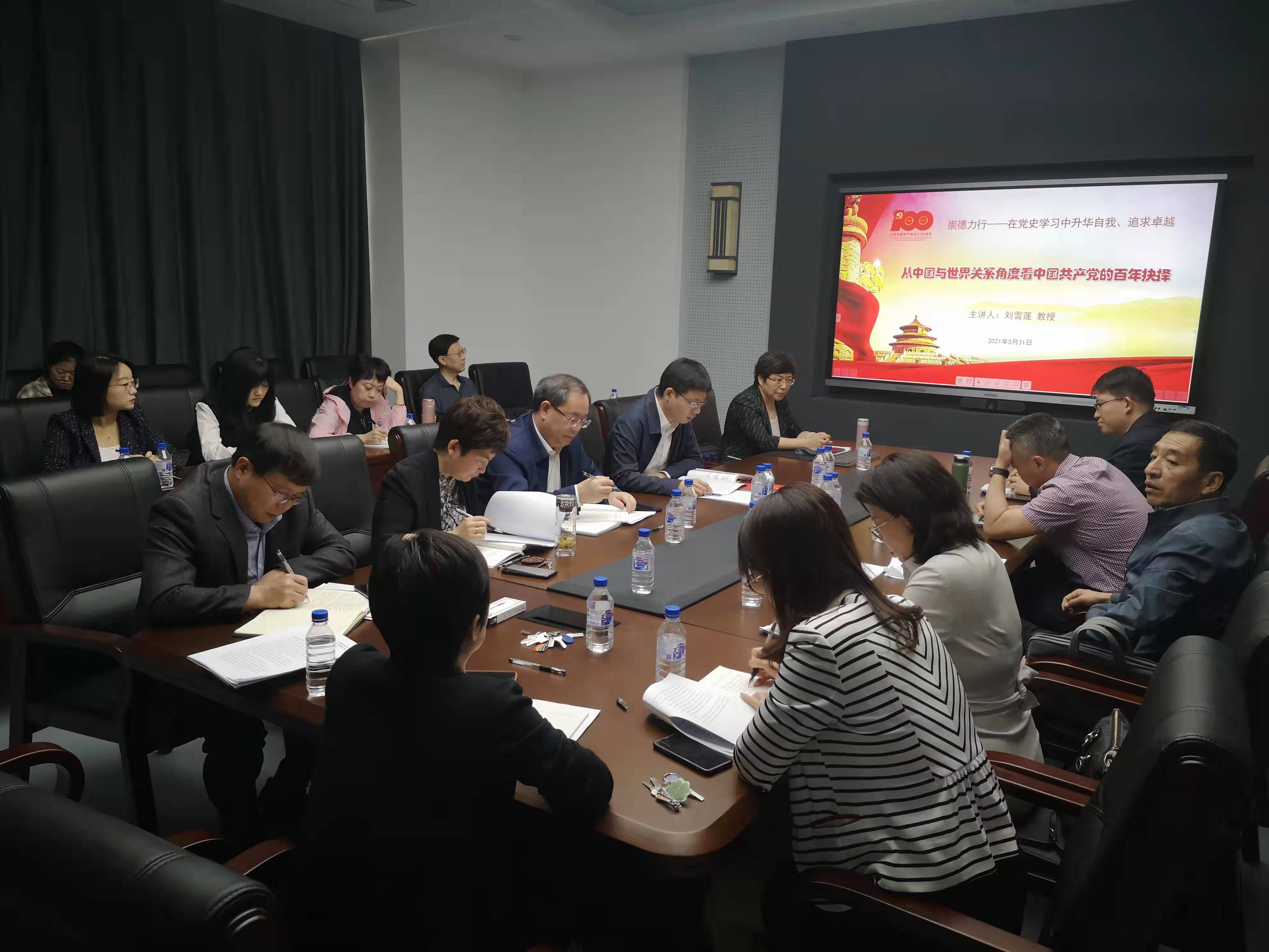 按照公司党委理论学习中心组党史学习教育第一阶段学习计划,5月31日上午,公司党委理论学习中心组在东荣大厦B304会议室召开“崇德力行——在党史学习中升华自我,追求卓越”专题学习研讨会。公司邀请刘雪莲教授做题为“从中国与世界关系角度看中国共产党的百年抉择”专题导学报告,公司领导班子成员、党委委员、国际政治学系党员参加了本次集中学习研讨,公司党史学习教育第4指导组列席研讨会并作指导。会议由党委书记马景惠主持。
