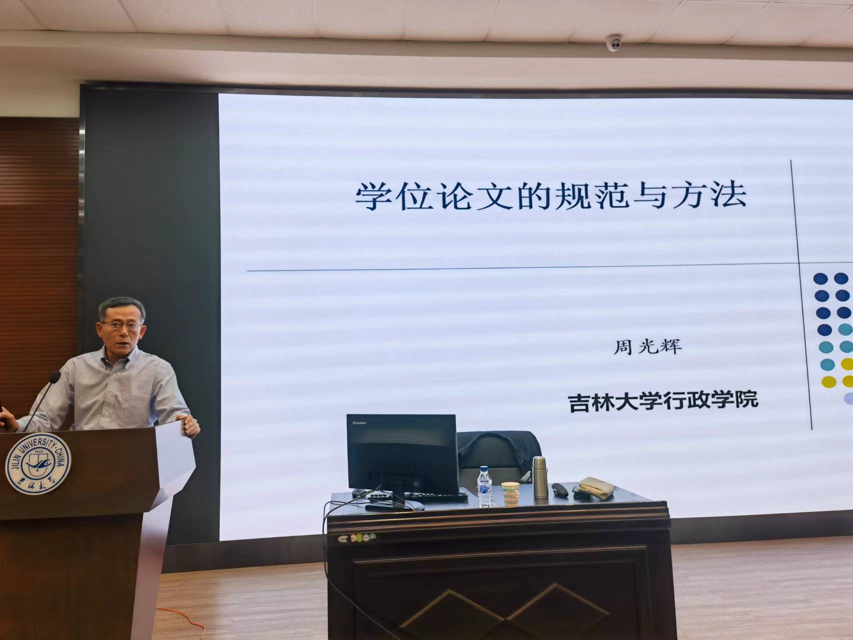 随后,周光辉为同学们讲述了学位论文的基本规范、撰写学位论文的基本方法。其中主要包括学位论文的标准、学位论文的质量评价标准、优秀学位论文的核心标准和学位论文的基本格式等内容,并通过四篇优秀范文和一篇论文修改个案和同学们分享了撰写学位论文的基本方法。周光辉结合学位论文质量评价标准,逐一阐述了论文选题、文献综述、研究成果、业务水平、学风和写作的不同要求。周光辉认为,创新是这一评价体系的核心要素,学位论文不是为了传播知识,而是为了生产知识、创造新知识,创新的实质则是探索未知,要做到超越实务界的常识性理解、超越知识界的现有认识。周光辉强调,研究生不一定都会成为思想家,但一定会成为有思想的人,这也是衡量研究生教育成败的核心。最后,周光辉再次提醒同学们一定要树立正确的科学道德意识,加强学术诚信,坚守学术底线。