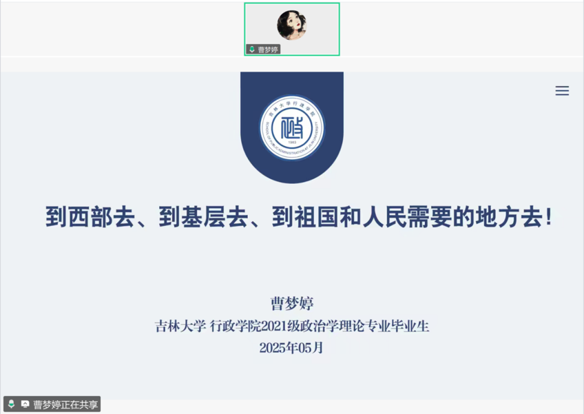 扎根基层一线,践行青年担当。在西部计划分享环节,2021级政治学理论硕士研究生曹梦婷以“到西部去、到基层去、到祖国和人民需要的地方去”为题,重点讲解了“什么是西部计划”“为什么选择西部计划”以及“如何成为西部计划志愿者”三部分内容。曹梦婷结合自己在新疆的志愿服务经历,生动讲述了与西部计划结缘的故事,深深感动了在场师生。在分享尾声,她以“在山的那边是用信念凝成的海”作结,展现了青年学子投身国家战略的责任担当。