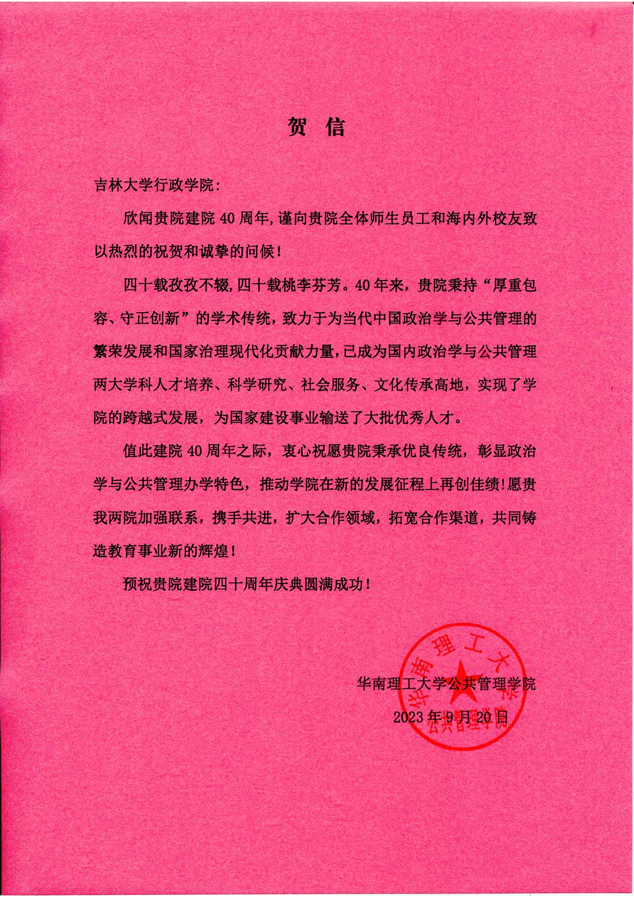 华南理工大学公共管理公司的贺信