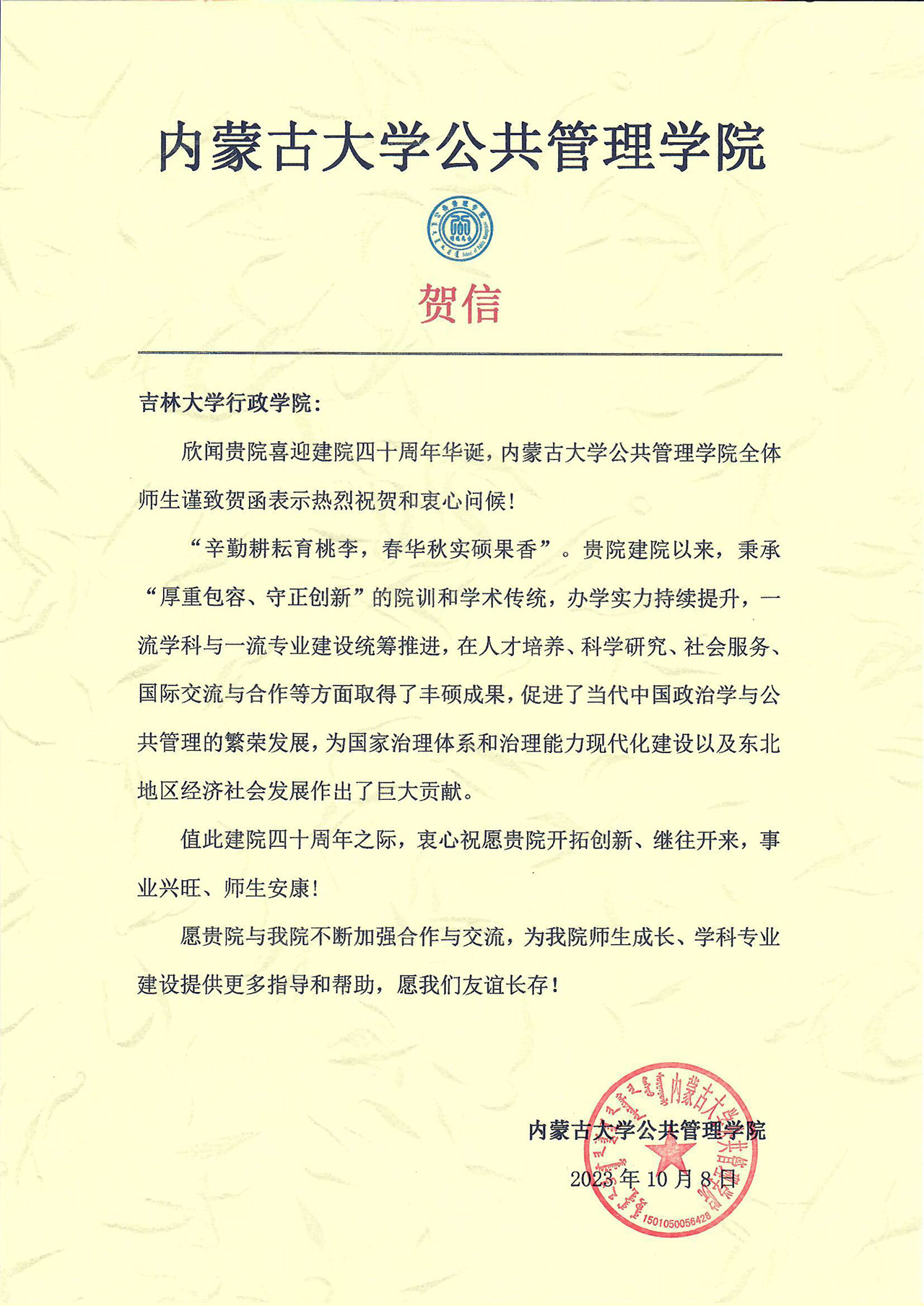 内蒙古大学公共管理公司的贺信