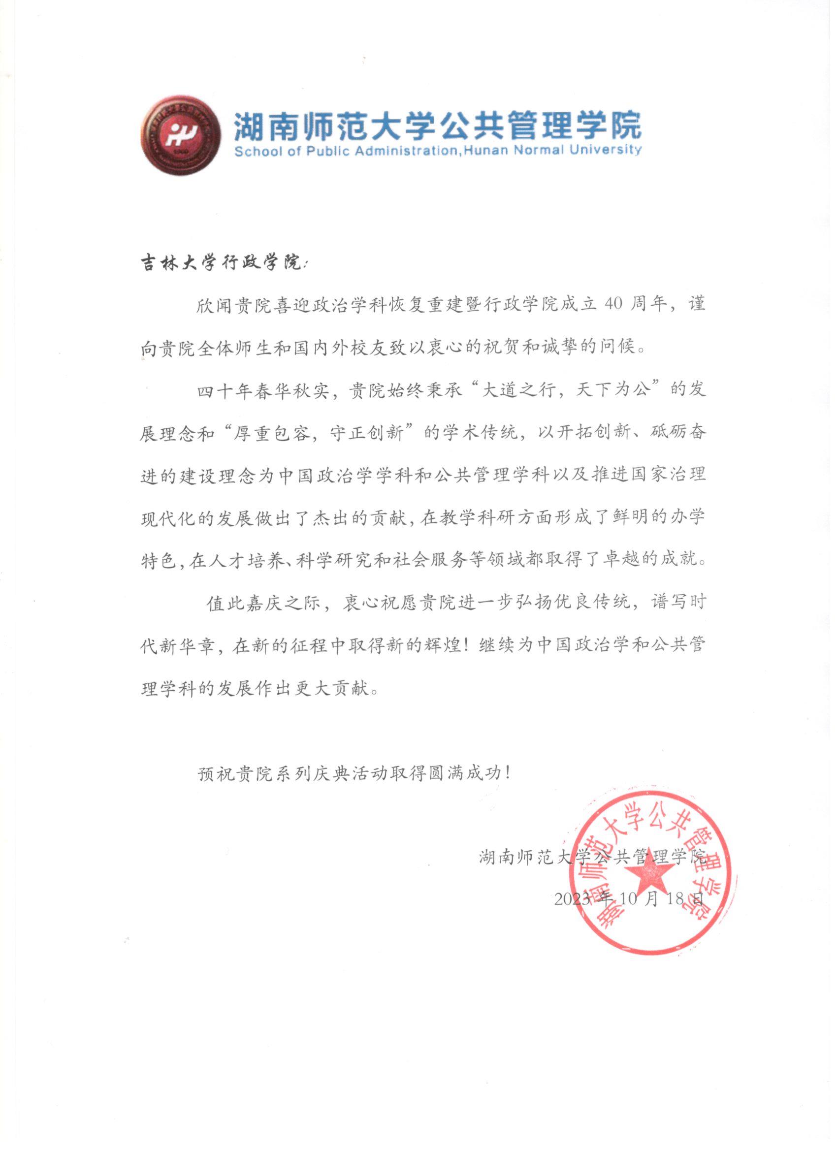 湖南师范大学公共管理公司的贺信
