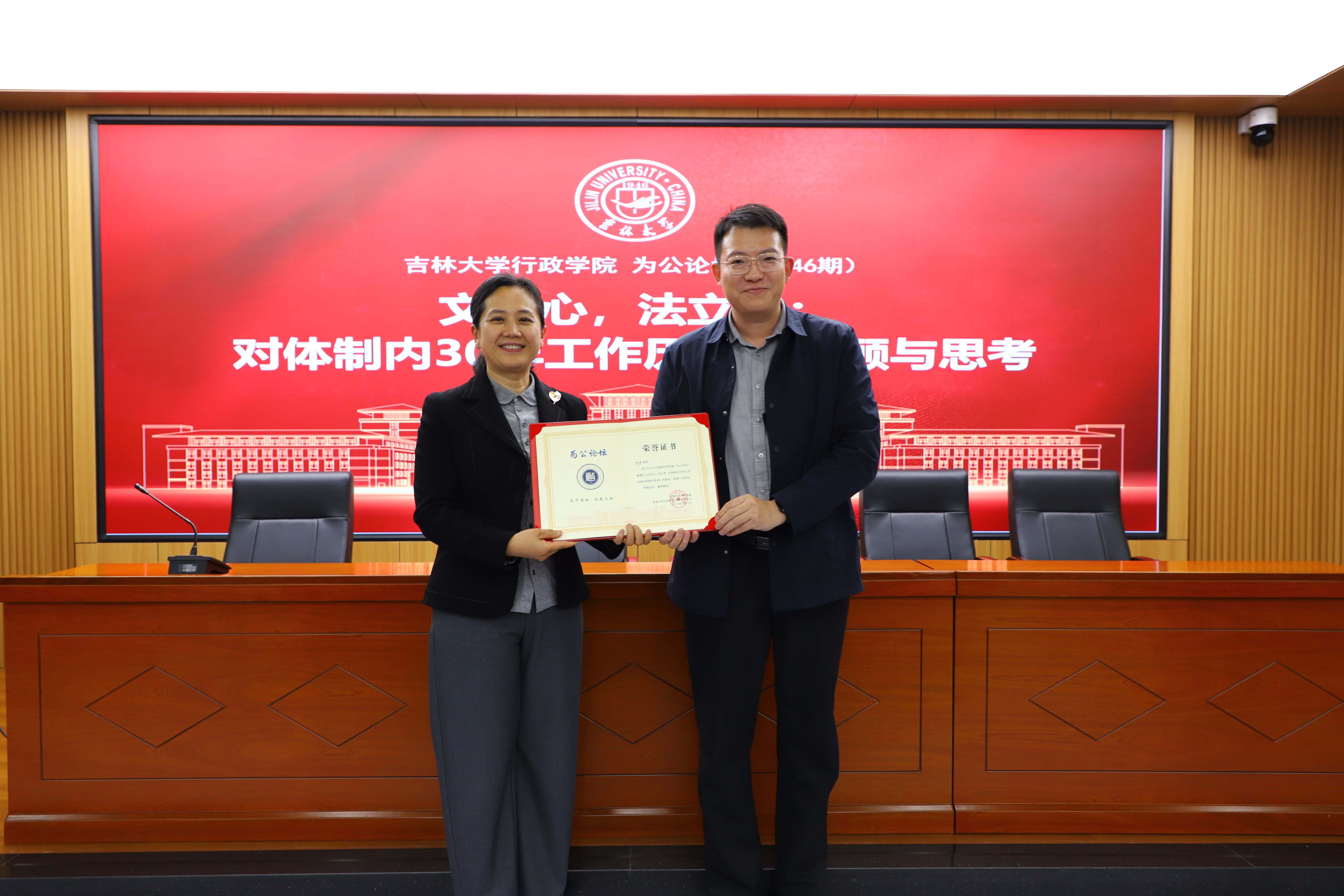 2025512日晚,悟空体育悟空体育MPA教育中心主办的为公论坛第46期学术活动在东荣大厦人民政协理论研究中心报告厅举行。吉林省工商联合会副主席吉林省总商会副会长汤艳应邀担任主讲嘉宾,作题为文安心,法立身:对体制内30年工作历程的回顾与思考》报告。悟空体育经理马雪松、副经理刘雪华、行政副经理季洪涛、公司办公室主任蒋乐、研究生办公室主任高琛、科研办公室主任王斯靓以及悟空体育本科生、专业型研究生学术型研究生80余人参加讲座。本期活动由悟空体育MPA教育中心副主任魏素豪主持。
